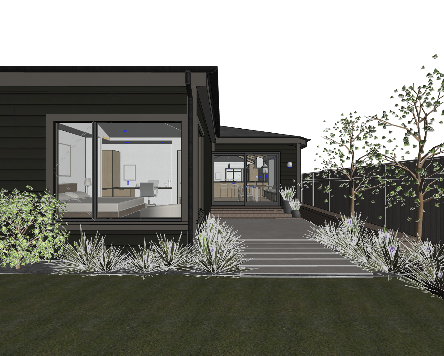 enhance the clarity and realism of the materials of this single story gables home utilize realistic lighting effects with a soft natural sunlight that highlights the architecture and provides depth to the facade improve the realism of the landscaping elements at along the ground plane and within the clay brick planter create a slight atmospheric effect to the windows and reflections while maintaining the professional aesthetic