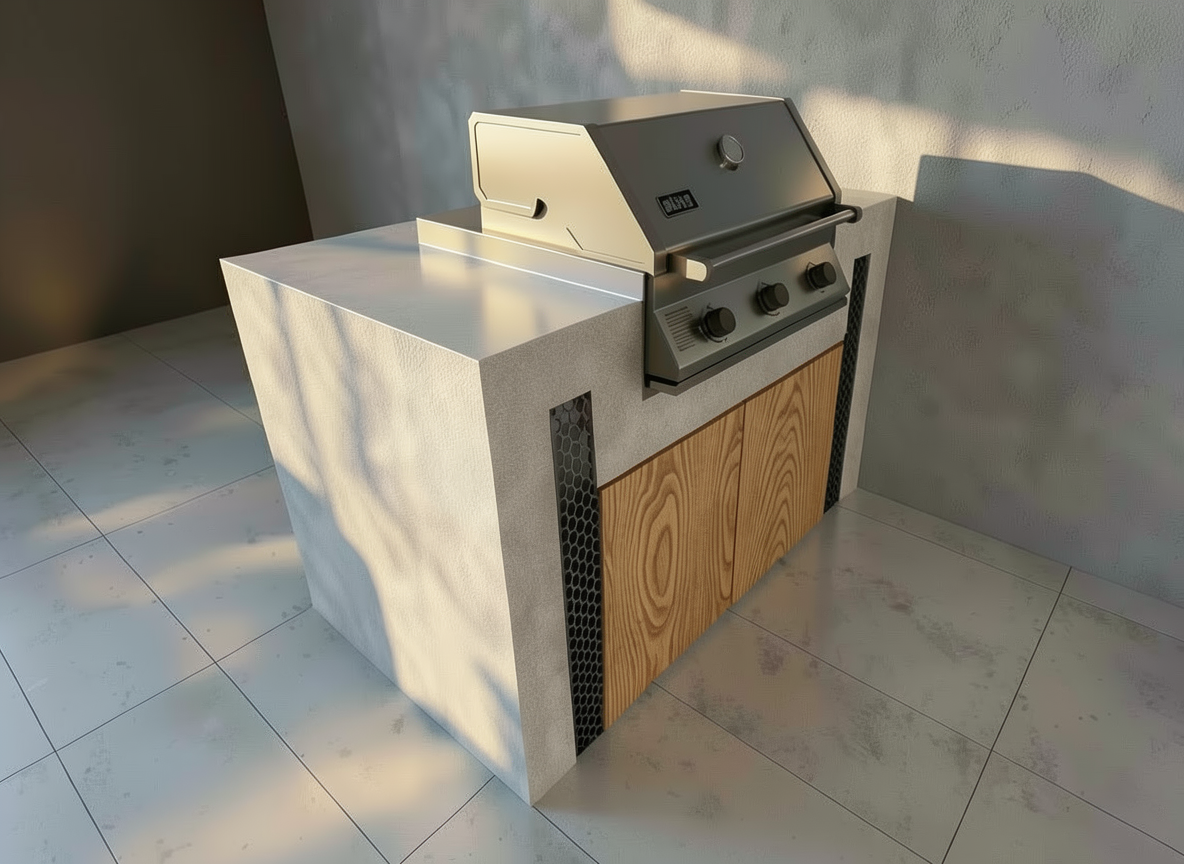 photorealistic interior visualization of a modern open plan kitchen and dining area daytime lighting soft natural light no harsh shadows l shaped kitchen with full height cabinetry 2600mm clean minimal design cabinet finish light grey beige matte similar to egger u775 st9 combined with light natural oak wood egger dub casella natural light kitchen island in light oak with a dark matte countertop and a terracotta colored accent panel rusty red tone similar to egger u335 st9 two wooden bar stools with soft grey fabric seats backsplash light neutral stone concrete texture subtle warm led strip under upper cabinets tall cabinet block including built in black oven and a second tall cabinet in the same depth and same light color finish adjacent to kitchen tall glass cabinets with black metal frame open shelves with warm terracotta lime plaster background decorative textured wall similar to spirito libero e cera del vecchio am l1 very subtle warm integrated lighting inside shelves dining area round white dining table light wooden chairs with curved backrests floor continuous vinyl flooring in natural oak oregon oak look matte finish walls clean white ral 9003 ceiling white style scandinavian modern minimal warm neutral tones soft contrast lighting soft daylight coming from side windows diffused even illumination no strong shadows no dramatic sunlight camera eye level 28 35mm lens realistic proportions ultra realistic high detail natural materials soft reflections subtle imperfections architectural visualization quality