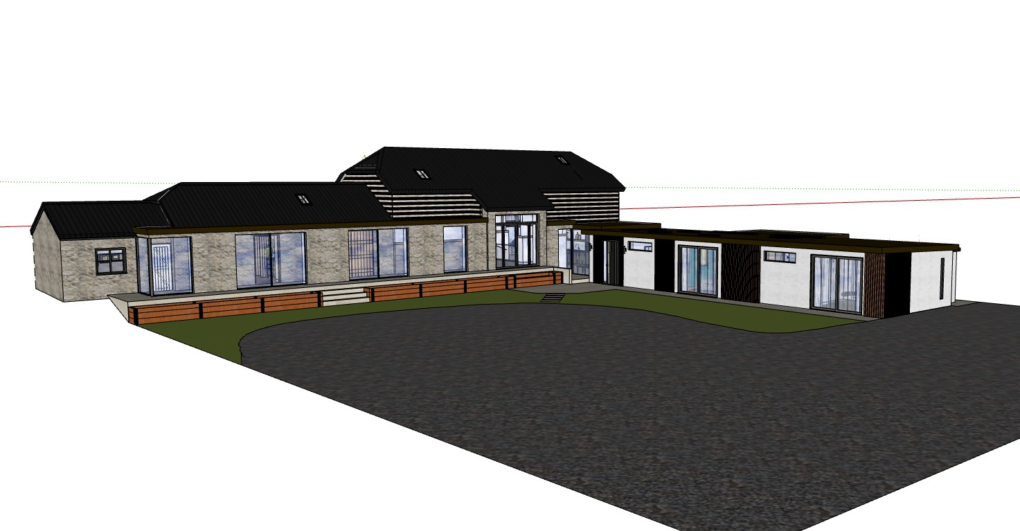 create a beautiful architectural rendering of a modern house with a black roof textured light gray stone and white walls and large glass windows the entrance is grand and inviting surround the house with lush green grass and a gravel dark gray driveway add natural wooden accents to the exterior seating and a soft serene evening atmosphere with a golden sunset light casting gentle shadows on the building enhancing its architectural features make sure to add lighting to the exterior walls of the building maybe some lights down the steps