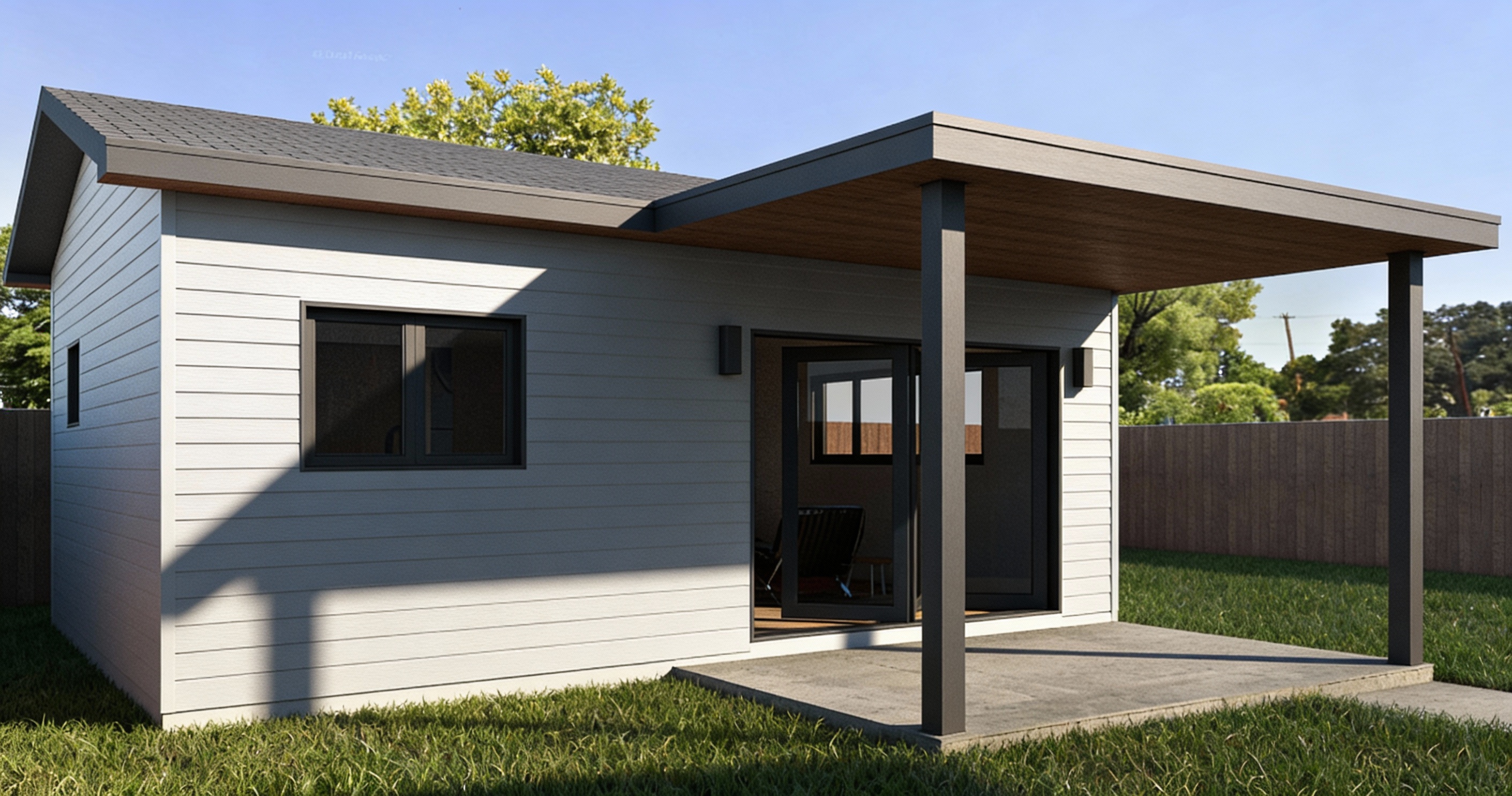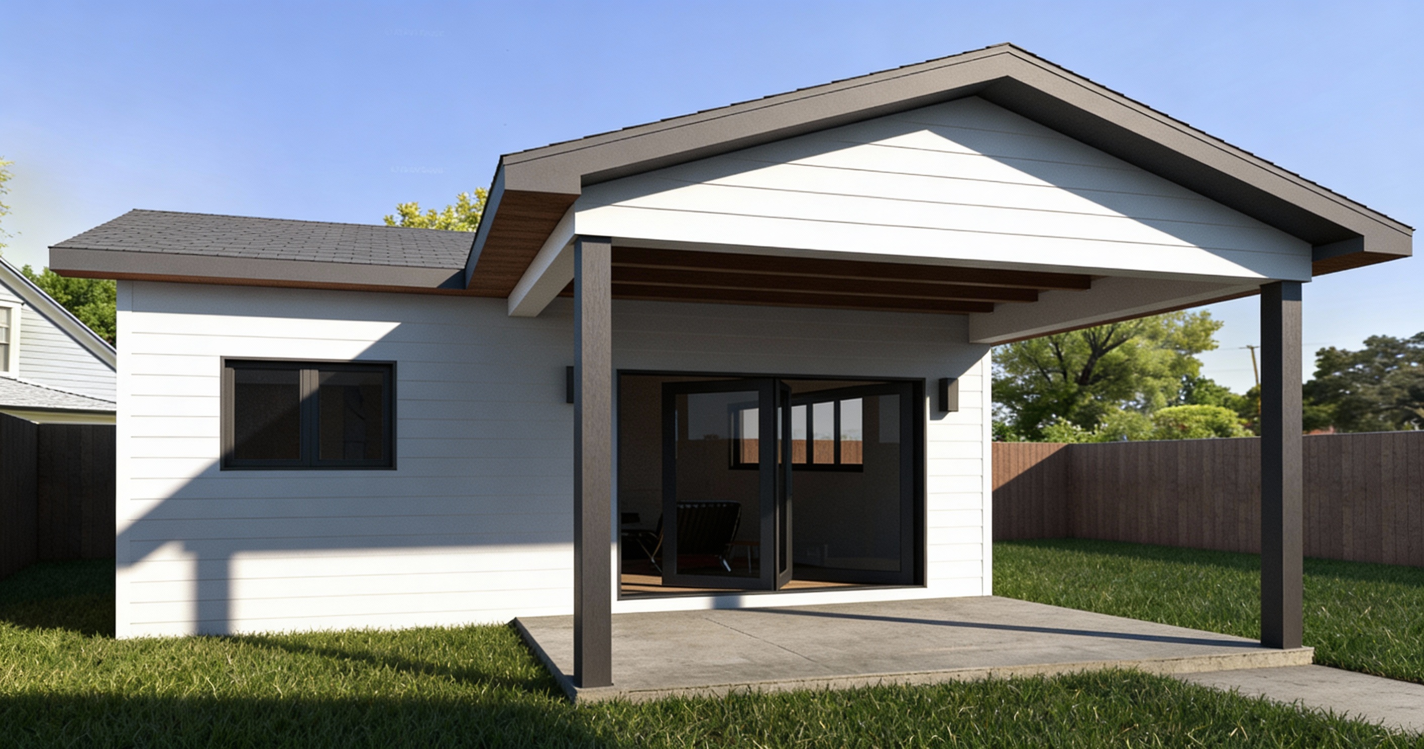 redesign adu with a modern look with an increased wider flat canopy that extends full width of adu make the canopy wider to the full width of adu do not show any beams exposed that support the canopy keep the posts and change to a flat canopy that extends to full width of the adu corner to corner canopy to be flat and increase the width to match the width of the adu