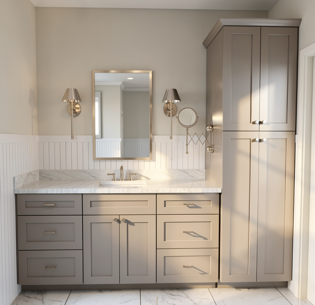 keep all finishes the same from the photo given and make it a realistic render make the siding a taupe grey biege color make roof black