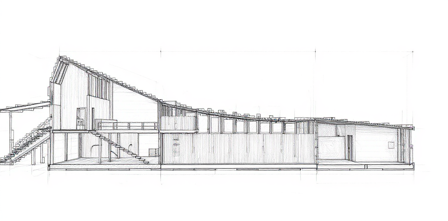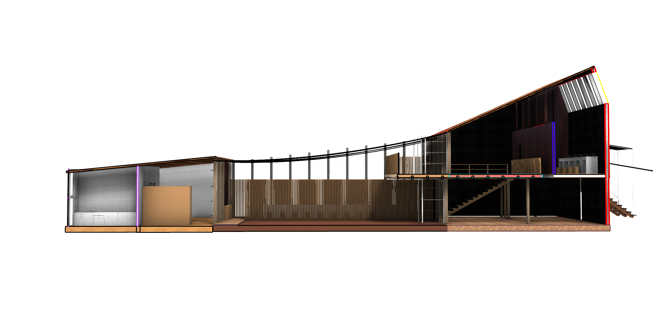 make a rendered section make black linework white background show structure under the house maintain material textures from the original image