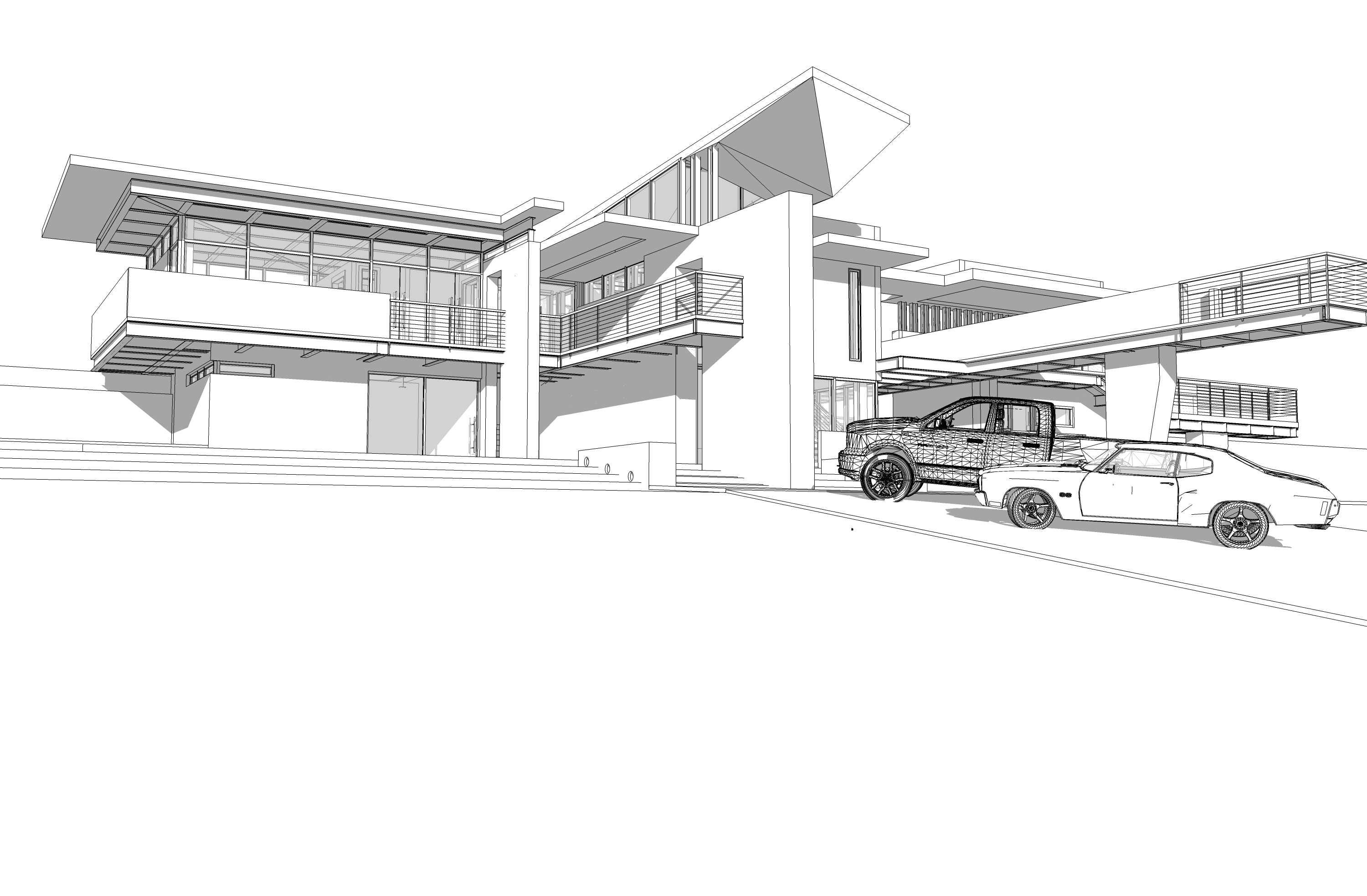 corten steel and concrete panels matte black car tall grass in foreground trees in background sunlight on building face dusk fog