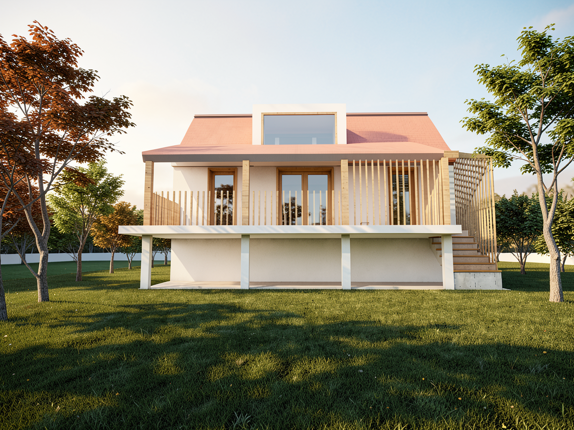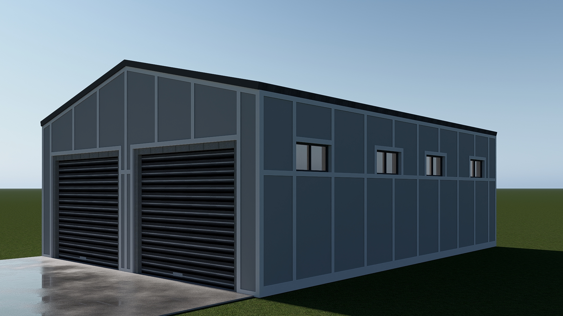 a modern industrial warehouse with sleek gray concrete walls and contrasting white panel lines the large garage doors are metallic black reflecting a soft gleam the underfoot wet pavement mirrors the building in the morning sunlight giving a dynamic and clean look the sky is a gradient of deep azure and pastel blue indicating a clear and tranquil day the surrounding grass is a vibrant green enhancing the contrast with the urban structure the atmosphere should be calm yet professional highlighting the structure s functionality and modern design photo realistic
