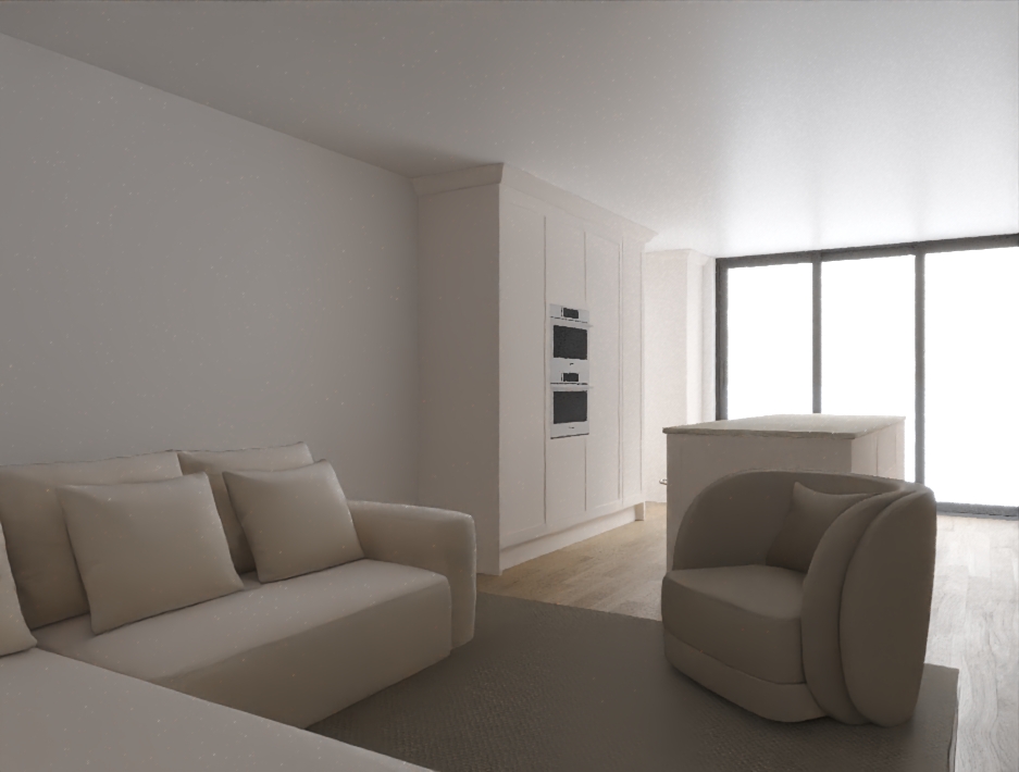 add all the decoration like cushions pendant lights artwork on the wall curtains improve the lighting make the units off white with small dark bronze bar handles add a hob onto the kitchen island make the armchair in darker velvet but not so much add burnt orange cushions on the sofa add a limewash effect on walls add artwork on the wall make the ovens black