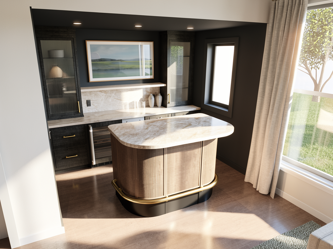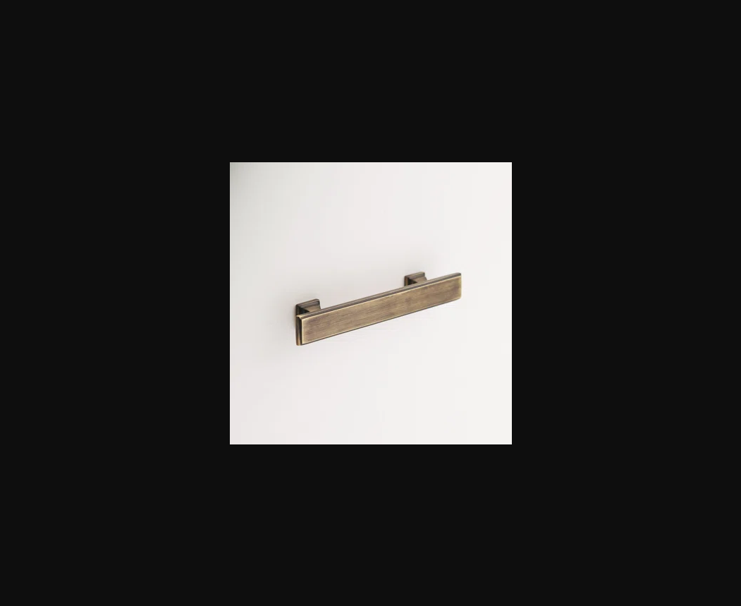 modern kitchen with warm taupe and mushroom flat panel cabinets featuring aged bronze rectangular bar pulls this antique bronze flat bar pull installed on kitchen cabinet doors and drawers warm beige quartz countertop textured linen look tile backsplash oil bronze faucet warm wood tones and mixed metals modern transitional kitchen professional photography