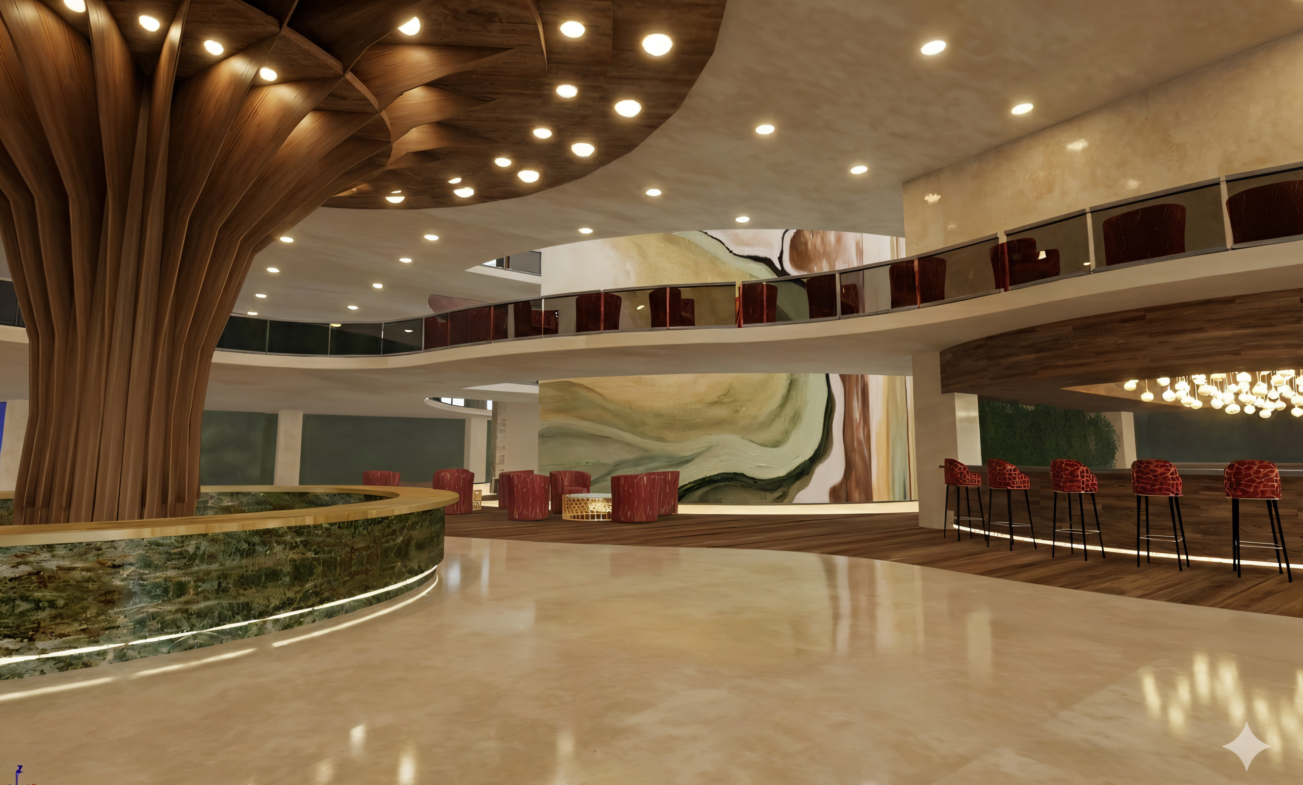 add people and fix the glass railing at on the second floor to look like one continuous glass panel do not alter anything else about this rendering given to you