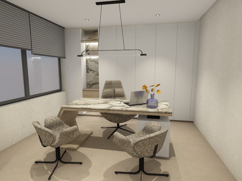 i want a modern luxurious office the boards behind the office is glossy white and where you see brown is a warm wooden color replace the chairs with modern ones ij greige color add decor and a carpet under the office in rectangular shape a summer one keep the marble material as it is in the photo but glossy on the top of the office table and in the back of the shelves in the wardrobe