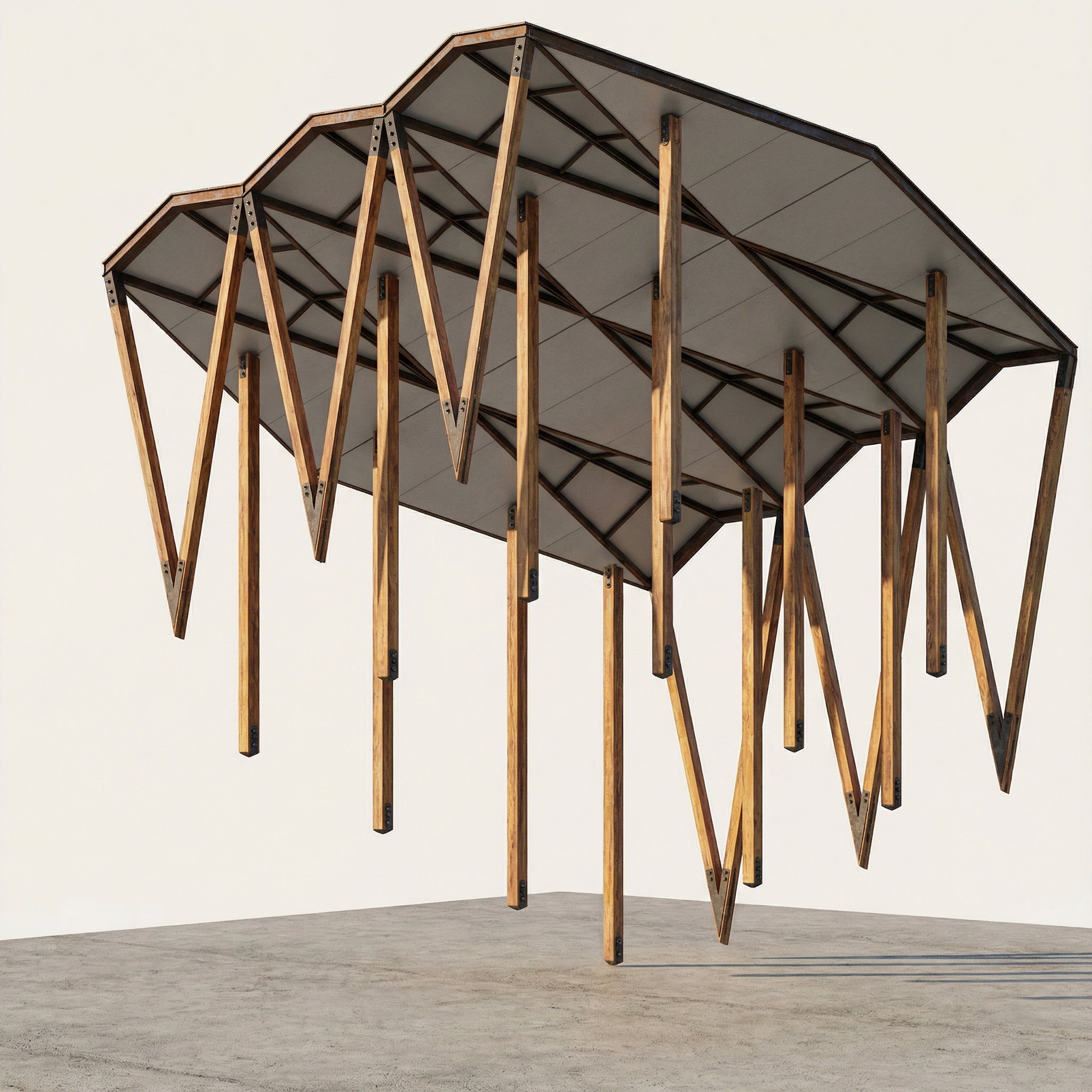 enhance this zoomed underside connection detail as an architectural rendering maintain the exact geometry do not redesign or remove anything clarify the materials as pale precast concrete for the frame and transparent glazing for the clerestory panels express subtle joint logic at the connection between the vertical support and the roof frame show a light seat plate or bearing point thin reveal seams and glazing channel articulation keep the aesthetic consistent with the larger pavilion rendering minimalistic soft shadows studio white background crisp edge lines and refined tectonic expression this should read as a technical architectural assembly detail not a redesign
