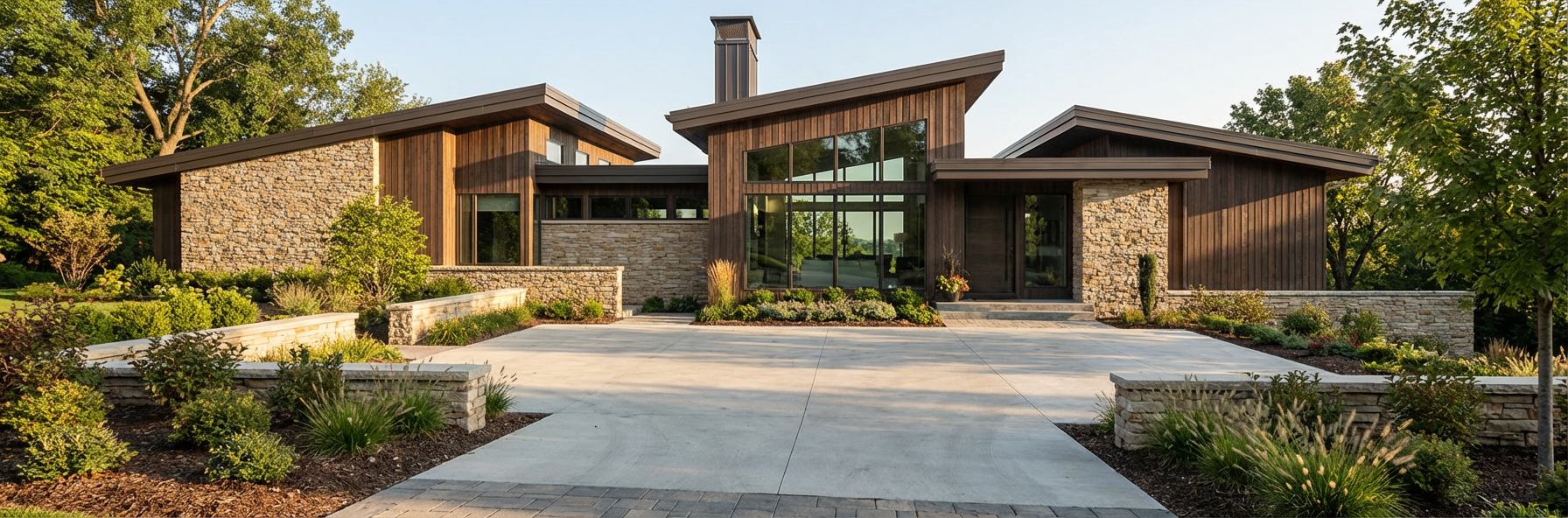 render realistically and maintain all finishes add landscaping and take off all writing make house sit on ground level with driveway infront with landscaping infront of it
