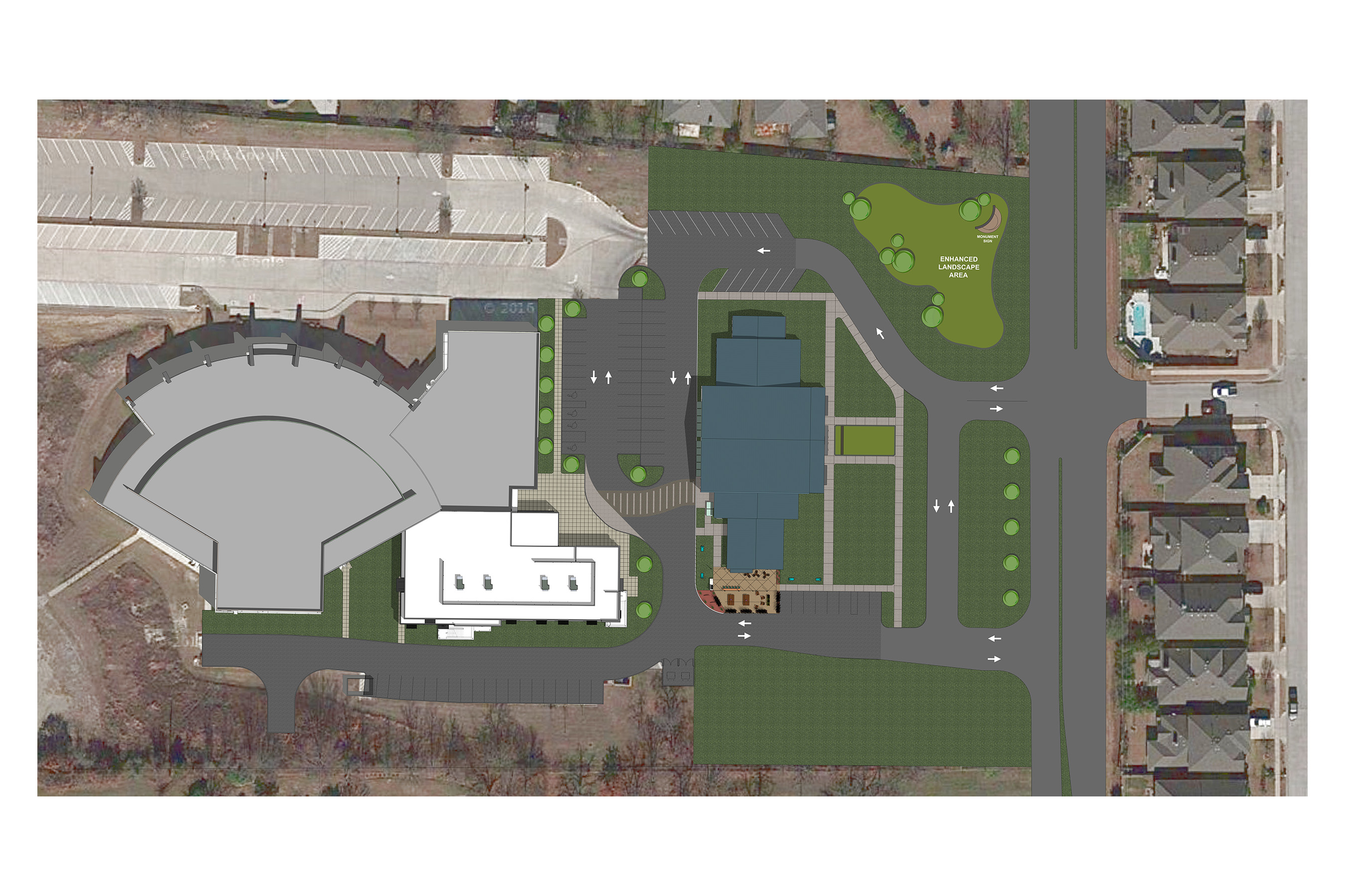photorealistic rendering slightly grainy add cloudy sky sign on the front of the building should read hillside community church