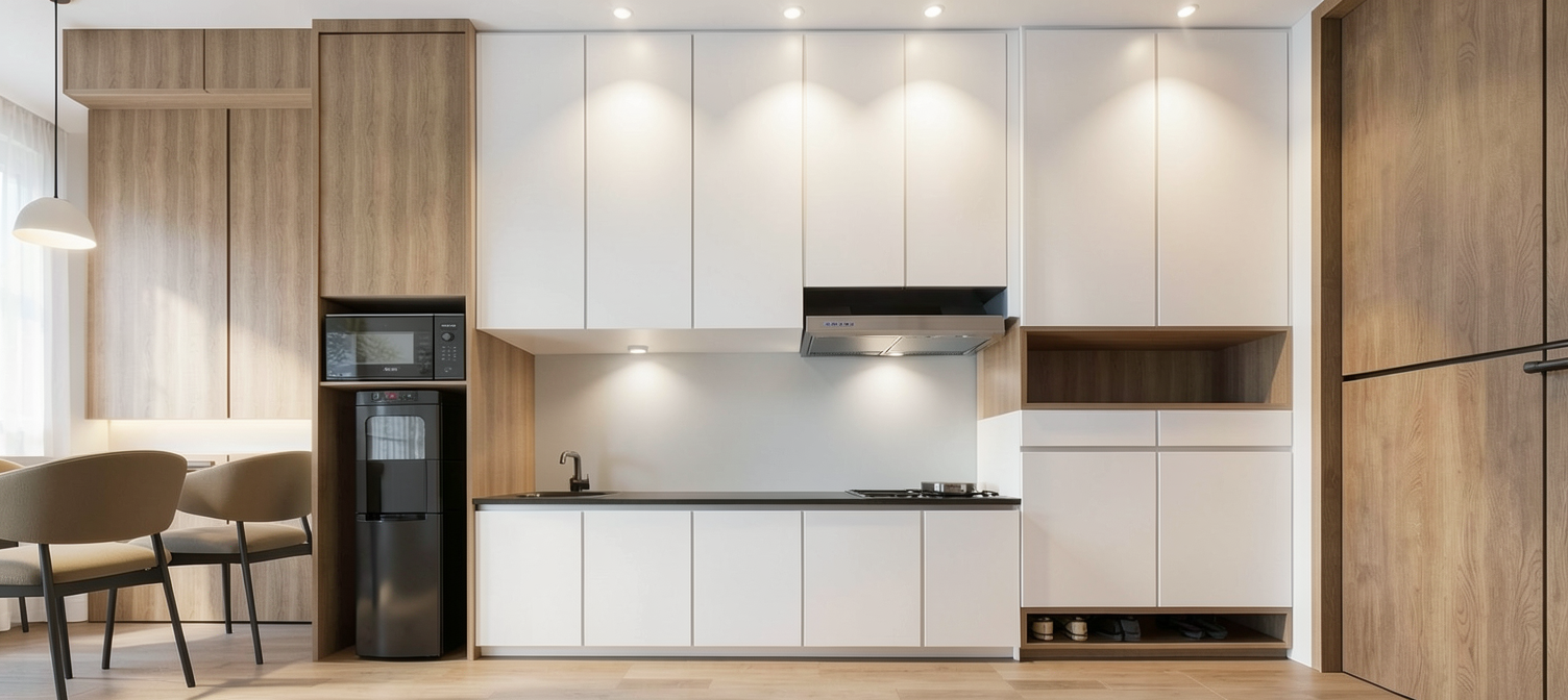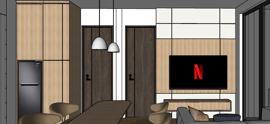 buat gambar ultra realistis tanpa mengubah struktur bentuk desain atau material apa pun jangan mengubah ukuran jpeg plafond warna putih tambah lampu spot light di plafond jangan ubah material warna dan bentuk dan tambahkan indirect light di atas panel kayu