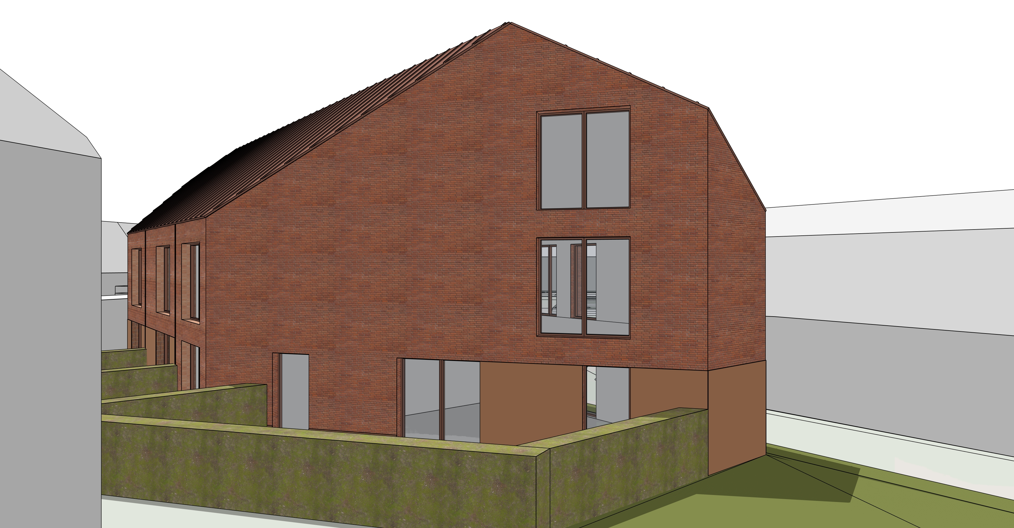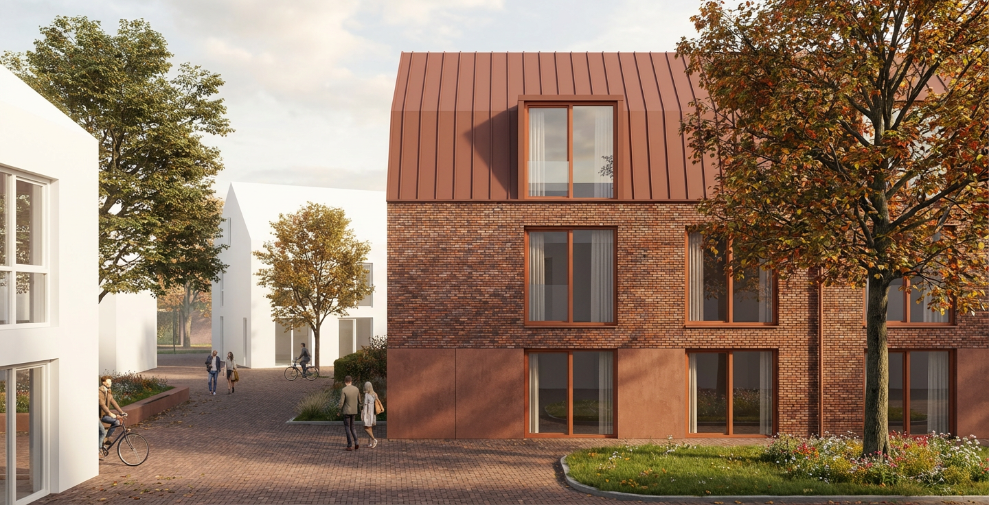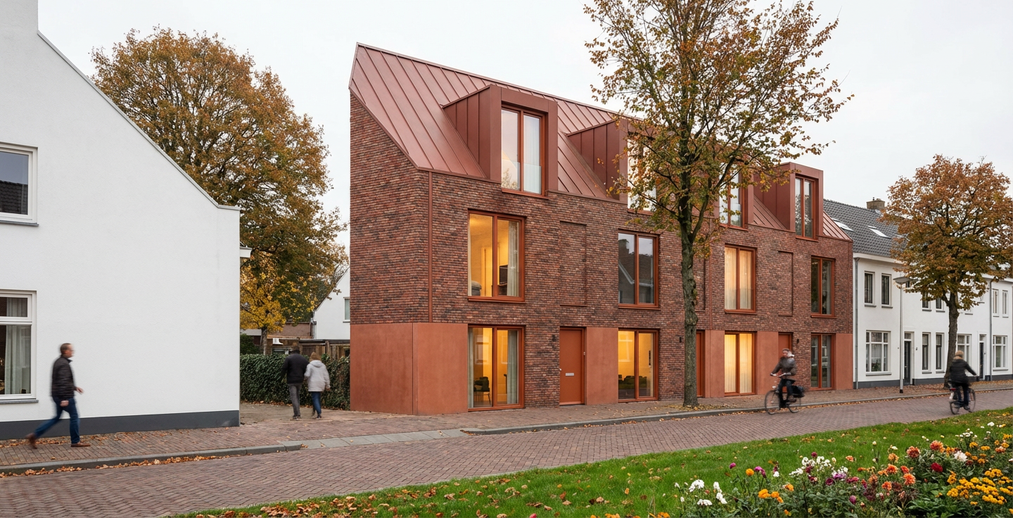 create a warm and inviting residential courtyard scene inspired by contemporary dutch architecture following the exact composition of the input image the main buildings should feature fa ades made of red brown mottled brick and window frames in an orange red brown tone the roof detailing must consist of vertical red brown panels with a matte weathered texture adjacent buildings may appear more abstract while still maintaining a sense of neighborhood cohesion these should be entirely bright white creating a strong visual contrast with the brick buildings between the sidewalk and the bottom edge of the ground floor window frames include a trasraam plinth made of pigmented concrete in the same color as the window frames depict an autumn like day in the netherlands with soft slightly diffused daylight and warm gentle tones on the right side of the scene place a green tree with autumn foliage in front of the buildings and add an area of grass with flowers in front of the building on the left side of the scene include a large tree positioned behind the white building and place another tree in front of the last building on the street add a pedestrian sidewalk and use traditional dutch style brick pavers for the street surface incorporate subtle landscaping throughout and include a few people walking or cycling to create a calm community oriented atmosphere