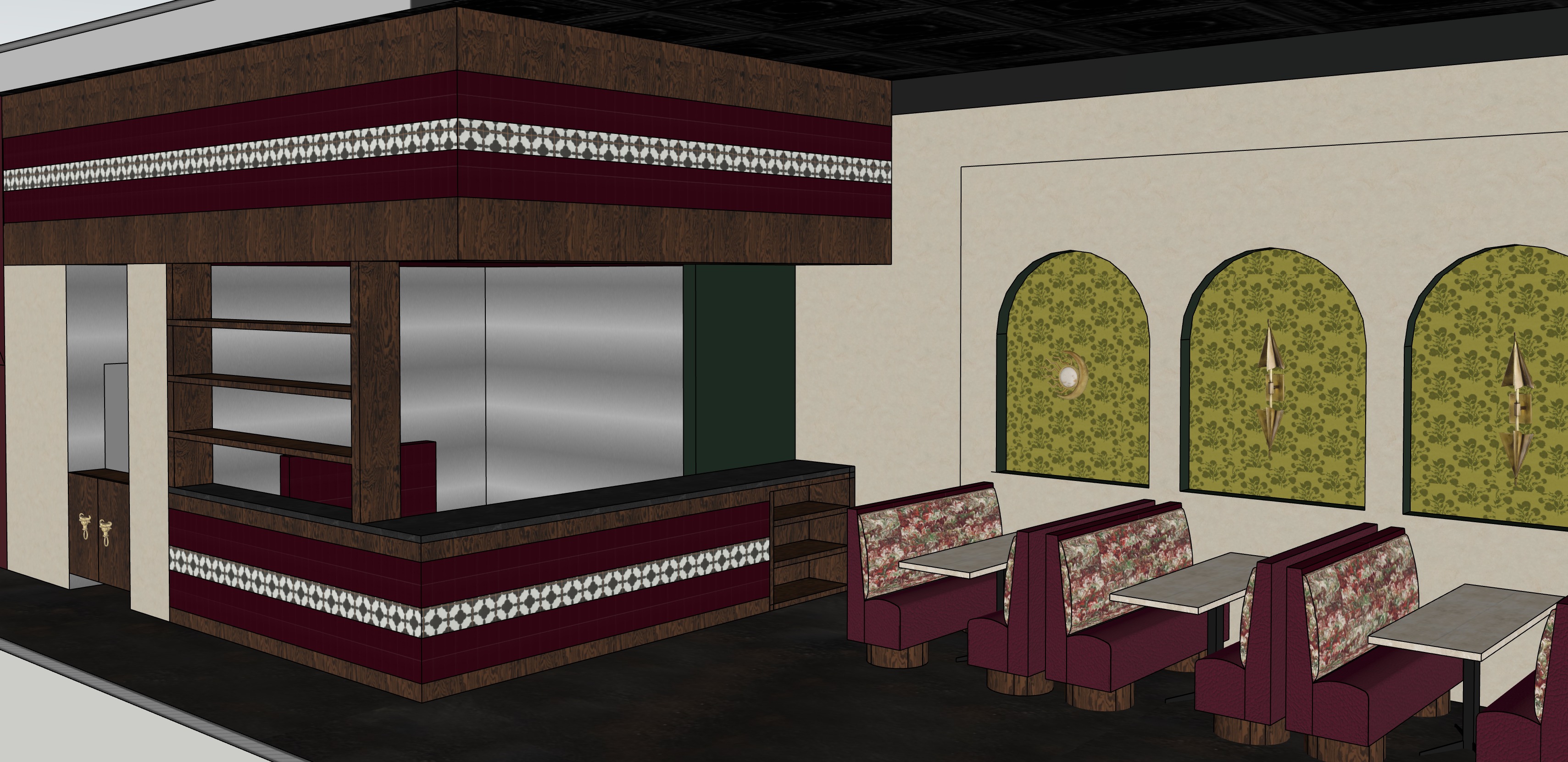 professional architectural photography of an upscale spanish tapas restaurant banquette seating area eye level perspective angled view along continuous banquette warm intimate hospitality atmosphere custom upholstered banquette in rich camel brown leather with realistic natural grain subtle creases stitching detail and slight tonal variation between panels softly worn leather texture with authentic reflectivity decorative upholstered top rail in marbled fabric with intricate pattern realistic woven textile texture and depth deep burgundy painted plaster wall with subtle hand applied finish variation matte sheen and realistic wall texture mounted polished brass bull head ring hardware evenly spaced across wall highly reflective brass material with realistic highlights subtle patina and natural imperfections dark stained wood tables with visible wood grain slight wear at edges and soft satin finish sculptural pedestal and caf tables with realistic metal patina oxidation and material variation fully upholstered dining chairs in cream boucle fabric with highly detailed woven texture soft fibers subtle shadowing and realistic compression at seat cushion exposed brick wall with authentic mortar joints material variation and realistic depth dark flooring with subtle reflectivity and natural wear patterns warm ambient restaurant lighting soft directional lighting from above realistic shadow falloff indirect bounce light from surrounding materials natural light entering from window with realistic exposure balance shot on full frame camera 50mm lens shallow depth of field professional interior photography hdr ray tracing global illumination ambient occlusion physically accurate materials ultra photorealistic architectural digest style dezeen style luxury hospitality photography extremely realistic materials micro imperfections subtle wear natural variation 8k resolution floor is a dark crarcoalstained concrete the chairs are a tan textured fabric there is a soft amber sunset glow illuminating the room evenly light from the ceiling brightens the vibe the paint is a more berry purple red the kitchen is all stainless steel high end kitchen equipment the arches are not windows they have wall paper and sconce wall lights