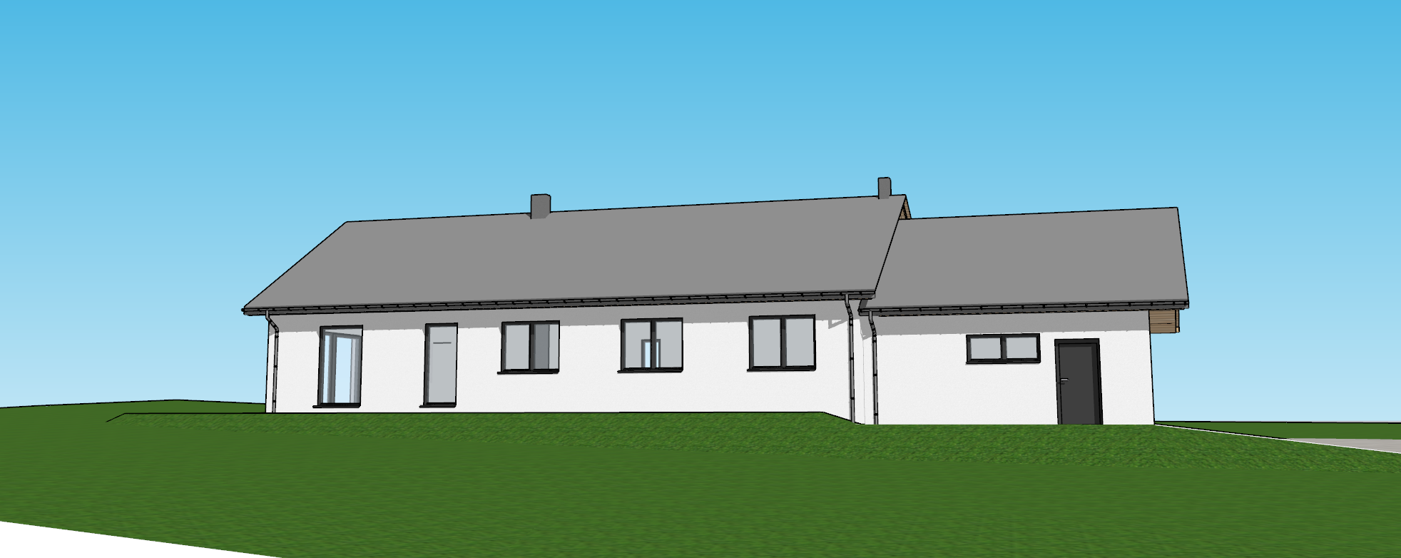 a roof made of flat grey tiles laid in a staggered pattern white plaster on the walls a thin grey horizontal strip on the gable wall anthracite coloured window and door joinery a chimney covered with grey seam sheet metal low bushes around the house a sunny sky a light wood soffit lamps in the soffit curtains on the windows children playing