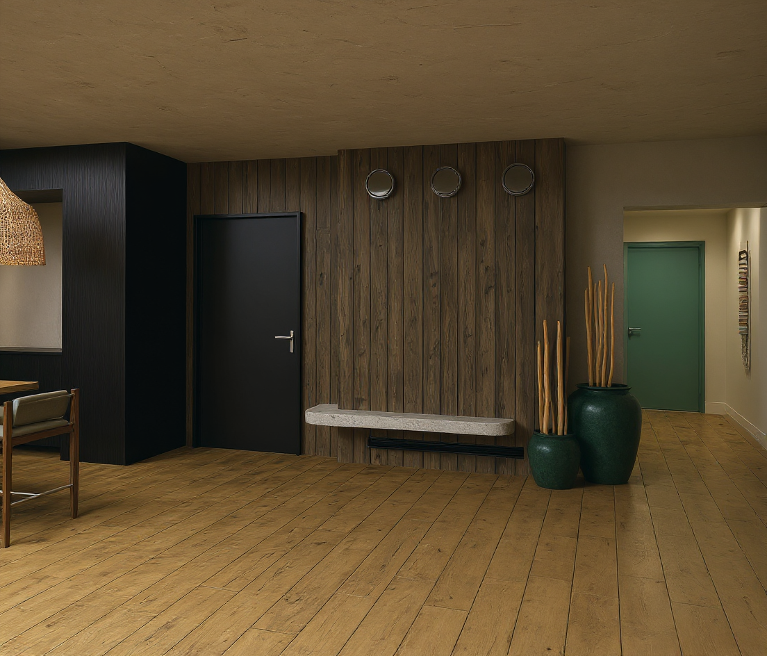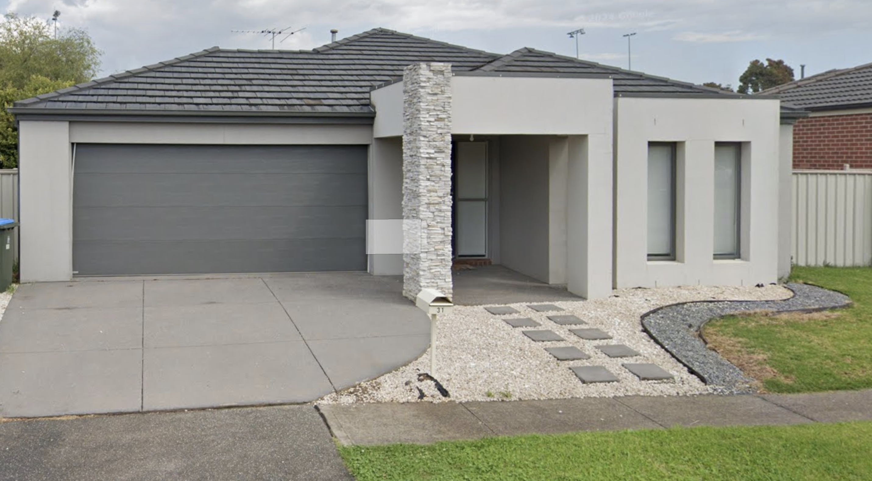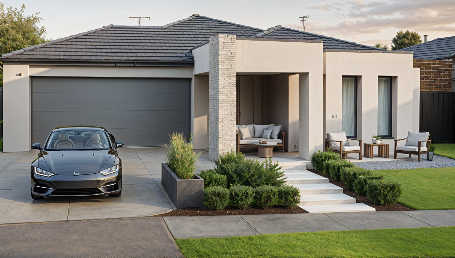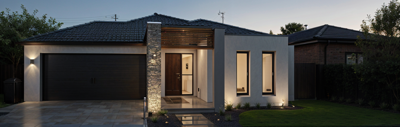 single storey contemporary suburban house facade low pitched dark charcoal tiled hip roof crisp white rendered walls recessed entry porch with square columns one a prominent narrow stone clad feature column and the other a dark grey column elegant dark brown timber cladding as a classy feature at the highest part of the recessed entry portico full height glass entry door with timber frame wide double garage with smooth white panel door minimalist front porch with floating white platform steps neatly trimmed low hedges and layered shrubs in a narrow garden bed bordered by dark mulch manicured bright green lawn black metal side fences clean concrete driveway warm sunset lighting with golden tones and soft long shadows photographed from street level high resolution realistic architectural visualization