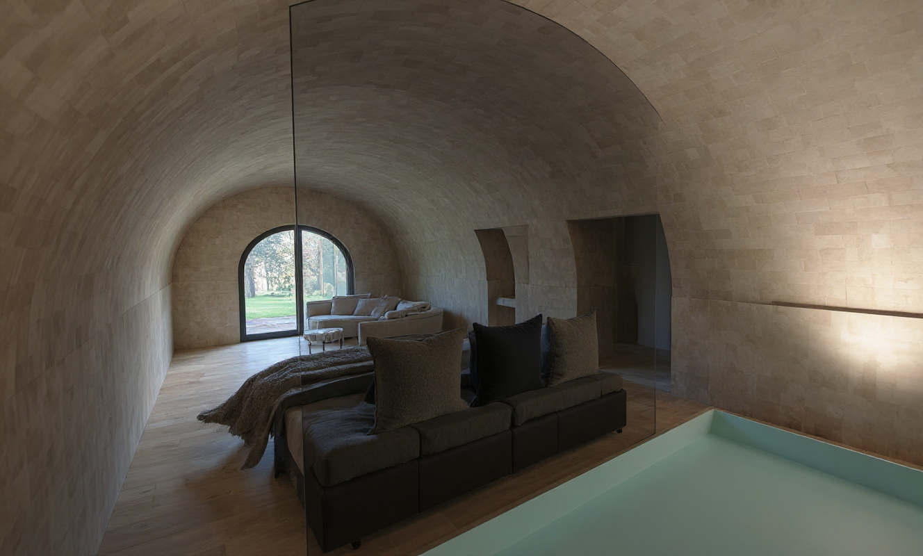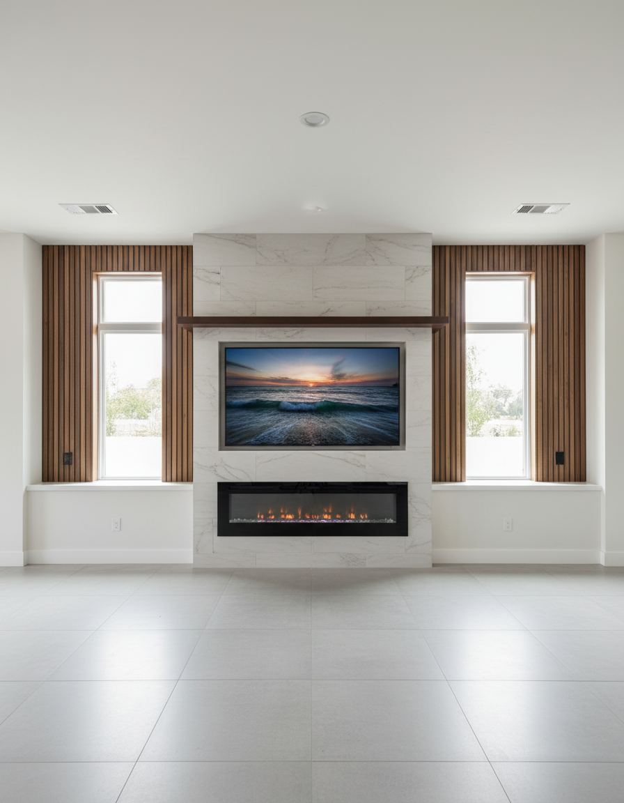 create an interior view of this wall the ceiling height is 11 the wall width is 19 4 the center section that is 8 wide protrudes forward 12 from the back wall from the chair rail to the floor the center section that is 8 wide protrudes forward 6 from the back wall from the ceiling to the top of the chair rail the back wall with the windows will have 2 vertical wood slats painted light blue above the chair rail where shaded the floating shelf above the tv should be dark brown the finish around the tv and fireplace will be light marbled tile show an 80 tv with an ocean scene drywall finish under the window chair rail the center 8 wide section is the only area that protrudes from the back wall the chair rail under the windows continues to run across the top of the fireplace