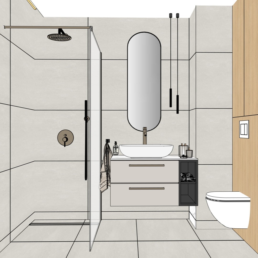 fotorealistyczna fotografia wn trza klasy premium projekt uk ad meble i materia y bez adnych zmian wzgl dem obrazu wej ciowego naturalne wiat o dzienne wpadaj ce z za kamery perfekcyjna ekspozycja naturalny balans bieli bardzo realistyczne materia y i detali zero zmian zero okien p ytki w ca ej azience maj kolor jasnego be u z delikatn szaro ci prysznic i bateria prysznicowa i umywalkowa jest w kolorze szczotkowany nikiel zlew i wc jest w kolorze bia ym obok lustra wisz dwie czarne w skie lampy lustro z czarn ramk z o wietleniem led za lustrem szafka umywalkowa jest w kolorze kaszmirowym z czarnymi otwartymi p kami po prawej stronie p yta drewniana w kolorze egger vicenza po lewej stronie w suficie jest wn ka z o wietleniem led