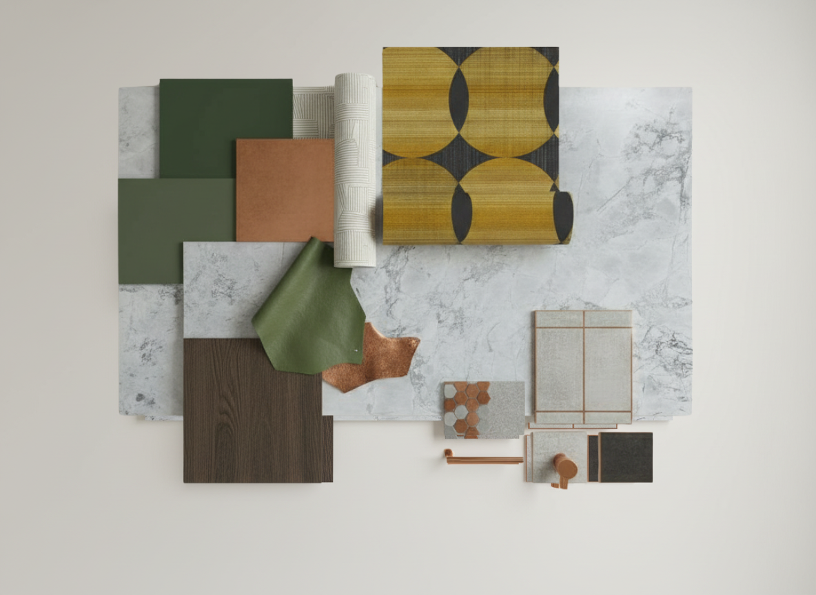 render a high end designer mcm wet bar from the moodboard featuring a slab of grey goose marble as the countertops and backsplash show any light fixtures as illuminated and add warm sunlight from nearby windows place appropriate bar fixtures and bottles in the scene grey goose marble has a medium grey background with subtle dark grey veins