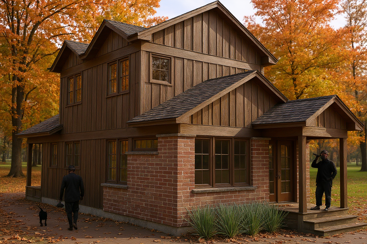 silver weathered cedar siding black shutters dark green window frames east texas piney woods setting limestone pilings add dog on front porch