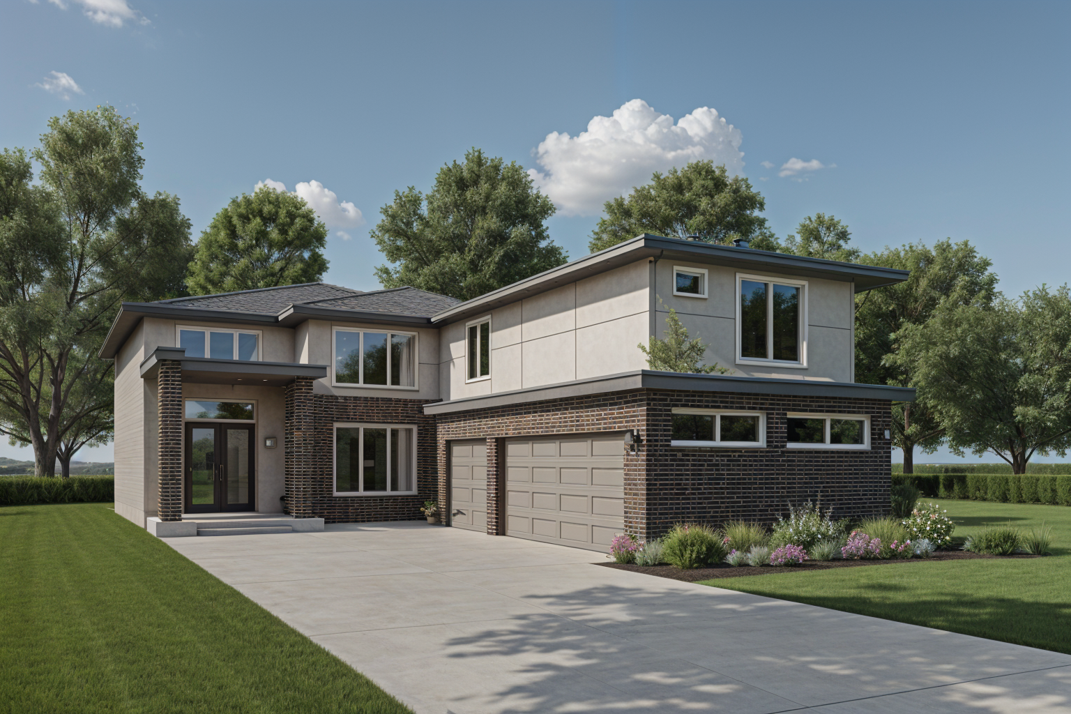 exterior shot a charming small house with beige walls and white trim surrounded by vibrant green hedges and palm trees the roof is a deep charcoal gray complementing the wooden door the sky is a clear vivid blue and the atmosphere is sunny and serene the front yard is covered in lush green grass separated by a neat stone path leading to a rustic wooden gate evoking a warm welcoming ambiance architecture
