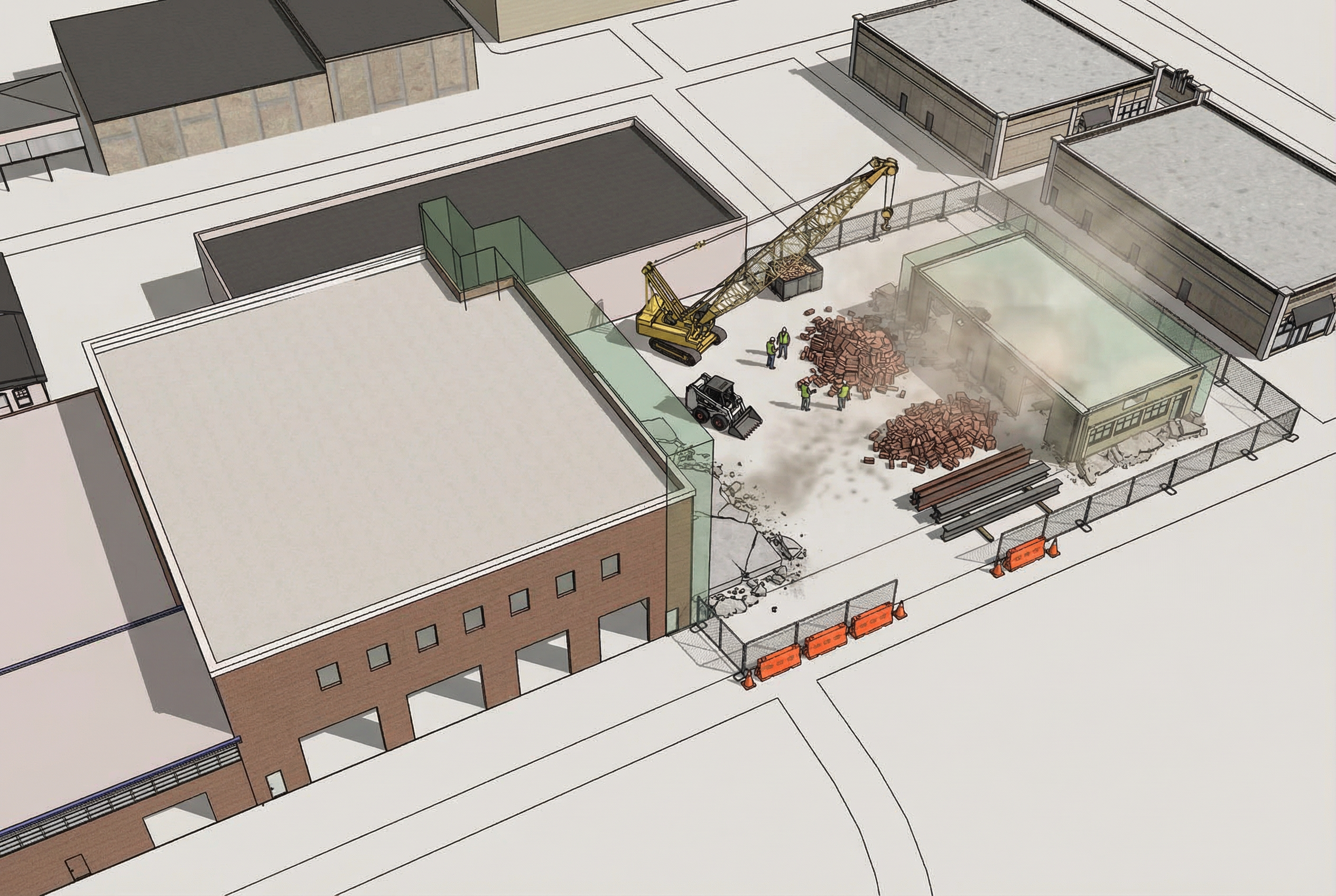 maintain all geometry and composition reduce the heavy realism grime and tire marks soften textures and simplify the ground back to a cleaner illustrated look lighten roof surfaces and remove intense weathering keep brick detail but make it flatter and more stylized like a diagrammatic rendering rather than photorealism keep subtle shading debris piles and construction elements but reduce contrast noise and grunge preserve clarity and legibility with softer edges and lighter tones so the image reads as an architectural phase diagram not a gritty scene