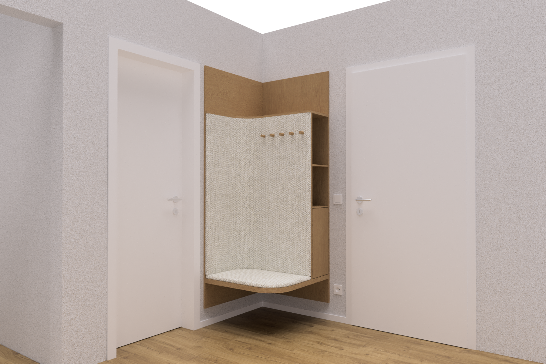 improve the realism of the provided interior render while strictly preserving the original composition and architectural intent strict rules must follow do not change camera framing proportions or geometrydo not add remove or redesign any elementsdo not introduce any new light sourcesdo not add led strips hidden lighting cove lighting or glowing ceilingsthe result must be based only on the provided imagematerial and color specifications walls light white plaster subtle texture matte finish floor natural oak wood flooring warm tone realistic grain and subtle imperfections bench chalk painted finish matte soft texture wall panels around the bench same chalk colorbench seat light grey upholstered fabric soft texture realistic shading wall hooks natural oak wooddoors light white matte finishdoor handles brushed stainless steellight switch light white next to the doorpower socket light white near the floorlighting very important use only artificial lighting from ceiling downlights recessed spotlights light must clearly originate from downlights aboveno led strips no indirect ceiling glow no hidden lightinglight should fall naturally onto walls doors bench and surrounding surfacescreate realistic light cones and soft falloff from downlightstemperature neutral warm 3000 3500k add realistic shadows especially under the benchin cornersaround door framessubtle ambient occlusion and contact shadows requiredrendering quality enhance global illumination and indirect bounce lightadd micro imperfections and realistic material response pbr keep the scene minimal and clean no stylization or extra effectsgoal achieve a physically believable hallway render lit only by ceiling downlights without any artificial or added lighting elements while staying fully faithful to the original image