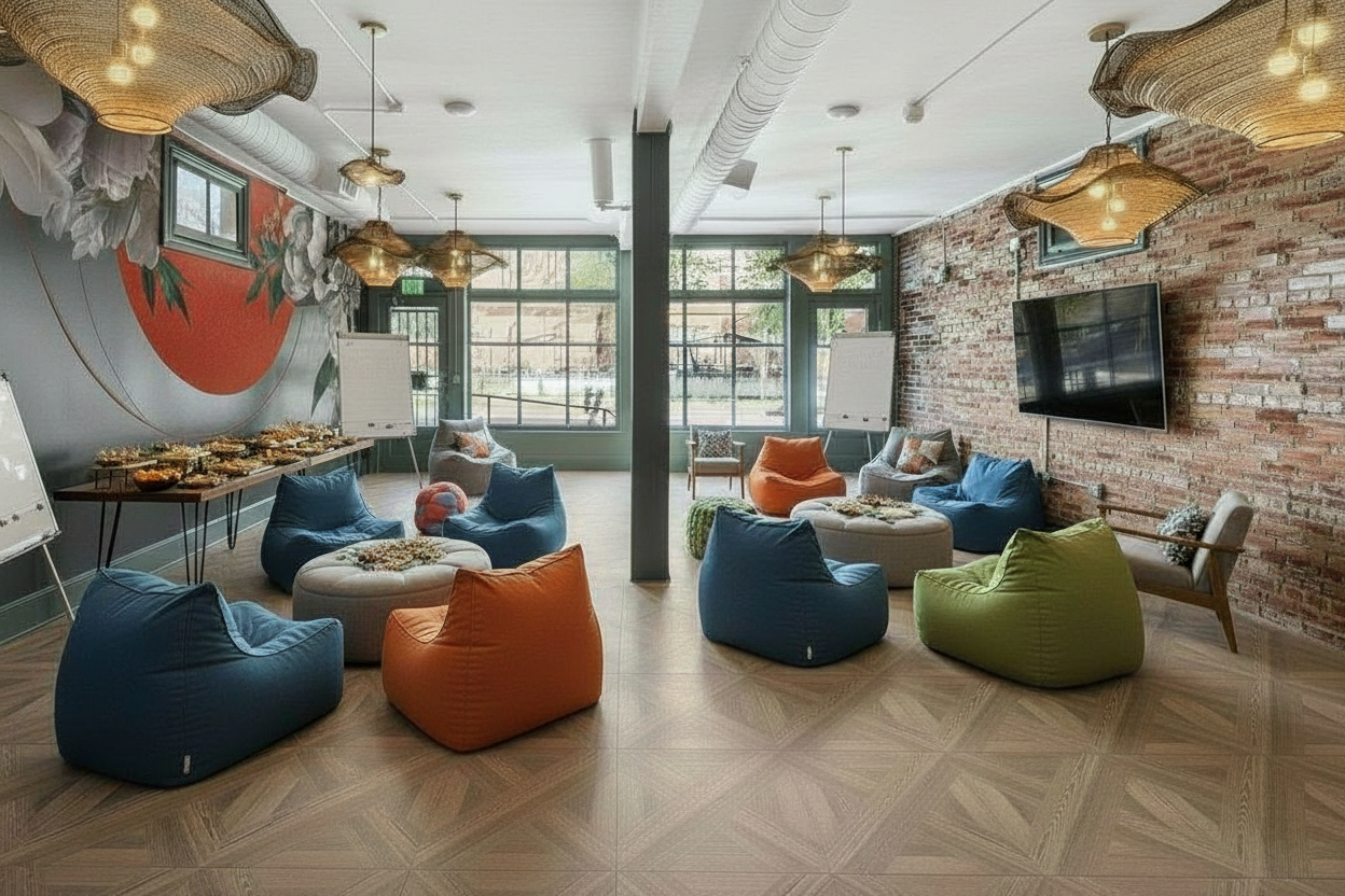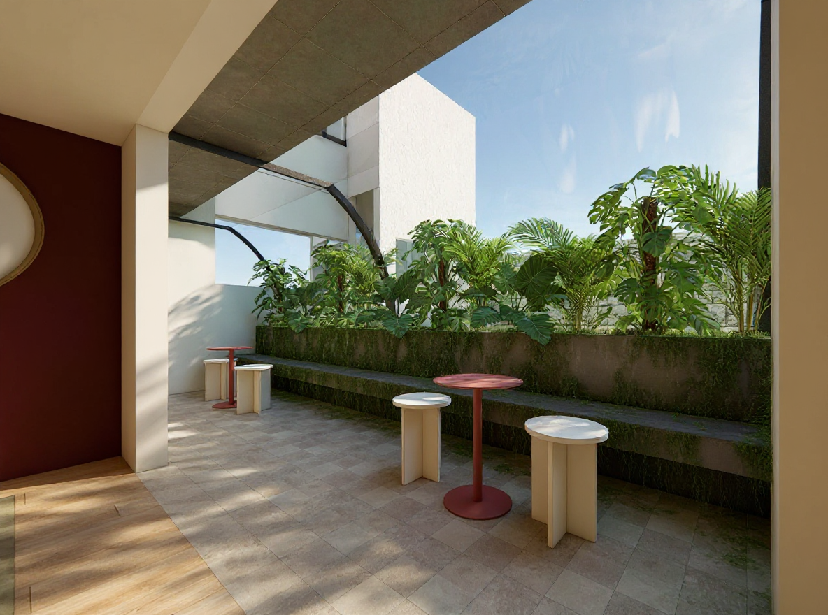 maintain the eight bays and the same number of over door awnings instead introduce colorful vertical build ups or bulkheads above each entrance these vertical elements do not need to be as tall as in the reference image but should stand out enough to add visual interest use a palette of fun lively colors such as yellows mustard tones oranges reds blues and turquoise to create a cheerful standout fa ade keep trim work minimal at the top and do not extend the pop ups too high just ensure each bay has a distinct colorful vertical accent that catches the eye add lively color accents to the stucco around the door areas and if possible incorporate some subtle corner accents at the far ends of the building to frame it nicely no wainscoting or heavy architectural detailing is needed just focus on the colorful fun aesthetic to transform the existing fa ade into a more inviting and dynamic look
