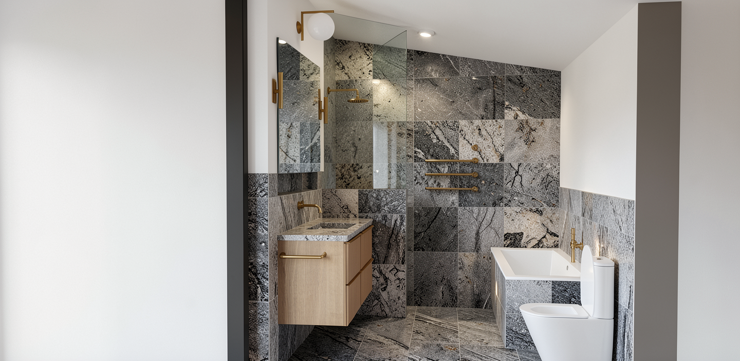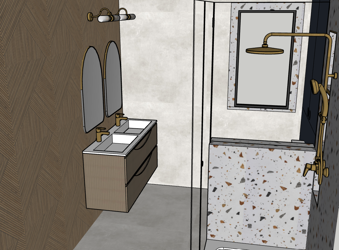evening sun with wall lights on above mirrors with led mirrors and one flush ceiling spotlight above shower