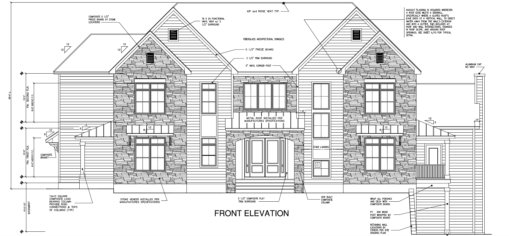 render this with gray stone on the towers but change the area around the front door to white stucco use white for the siding as well black roof