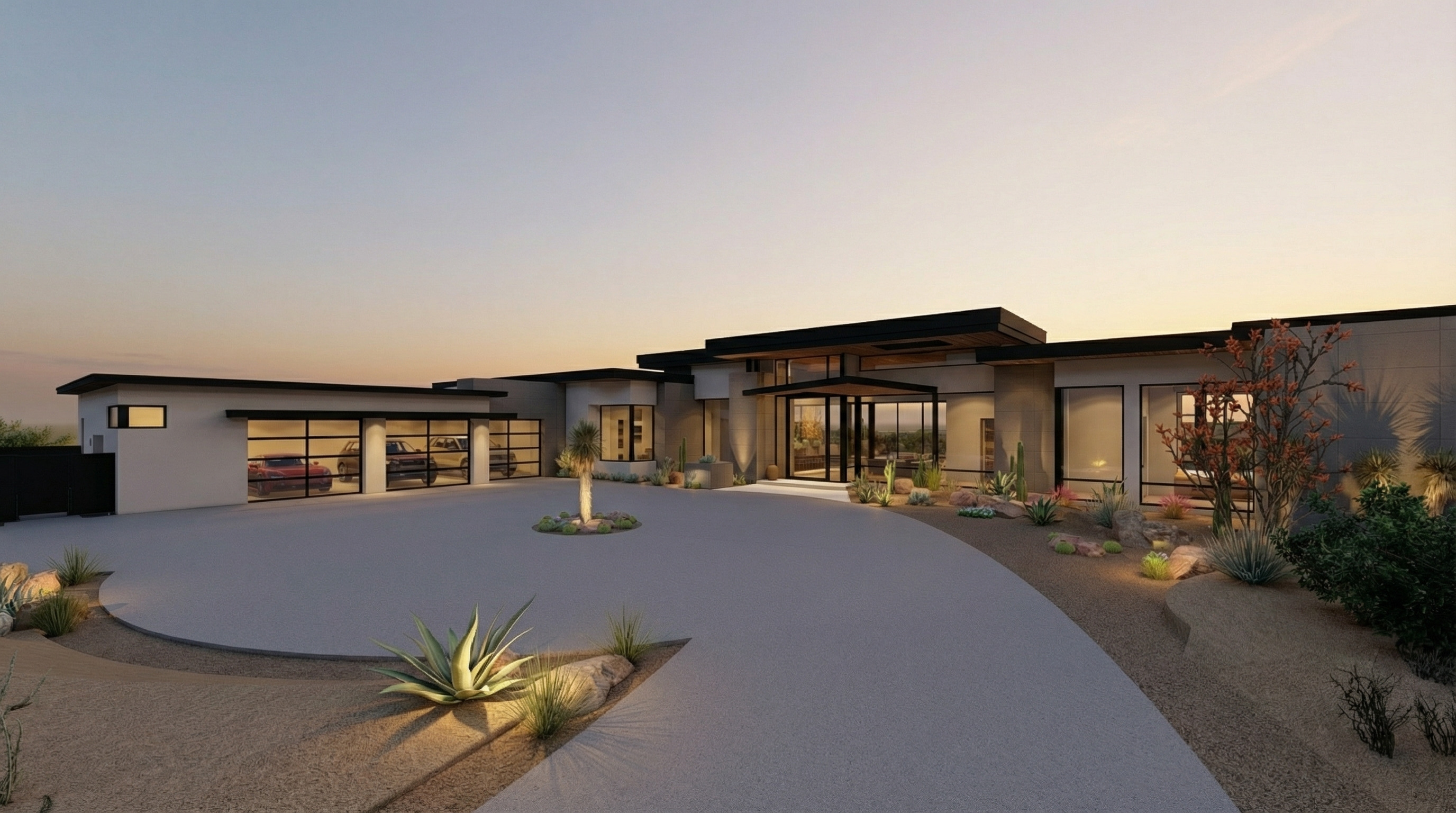 replace only the sky do not alter the house garage driveway landscaping lighting materials colors reflections or proportions keep the architecture and driveway exactly as shown create a realistic desert sunset sky with natural color gradients warm golden tones near the horizon blending into soft blue above add subtle wispy cirrus clouds with natural variation and slight atmospheric haze near the horizon lighting direction must match existing warm exterior lighting photorealistic natural dynamic range luxury real estate photography do not modify architecture do not change driveway do not alter landscaping no structural changes no material changes no color changes to building no perspective changes no dramatic storm clouds no oversaturation no fantasy sky please make clouds more fluffy and not streaky