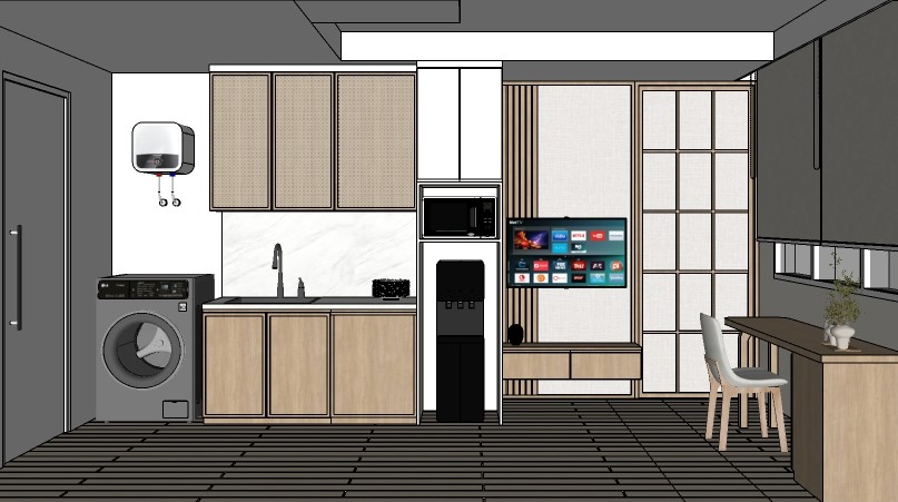 the rendering looks real and natural with a japandi style concept without changing the material shape and size of the image back of tv is white fabric material