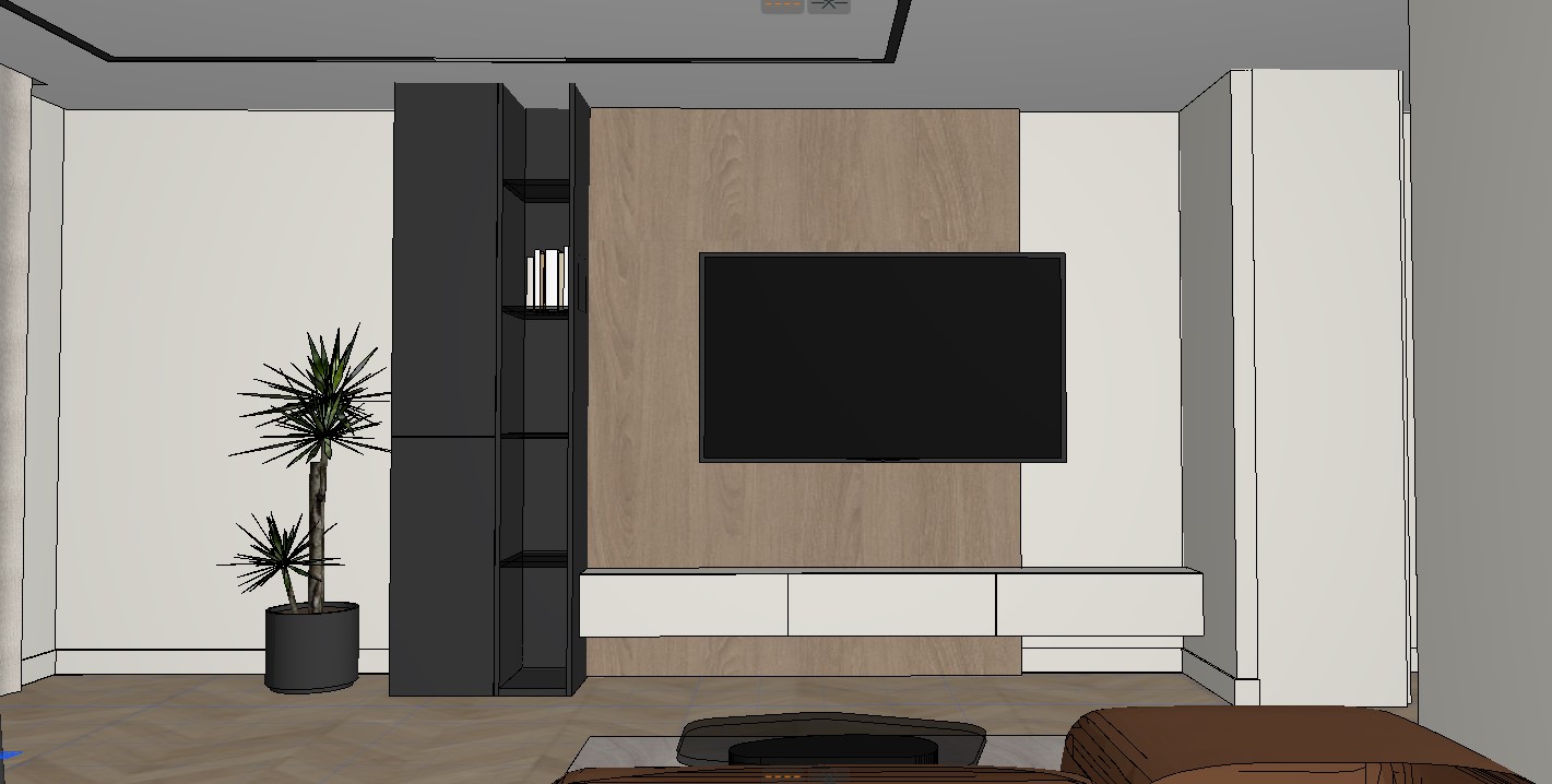 uralizji wizulazacje dodaj g rn a szczes po lki przy suficie ale zachowaj wsyztkie kolory i tekstury dodaj swiatlo led za panelem drewniny na scianie w pionowy sposob na aczeniu sciany i panelu drewninego