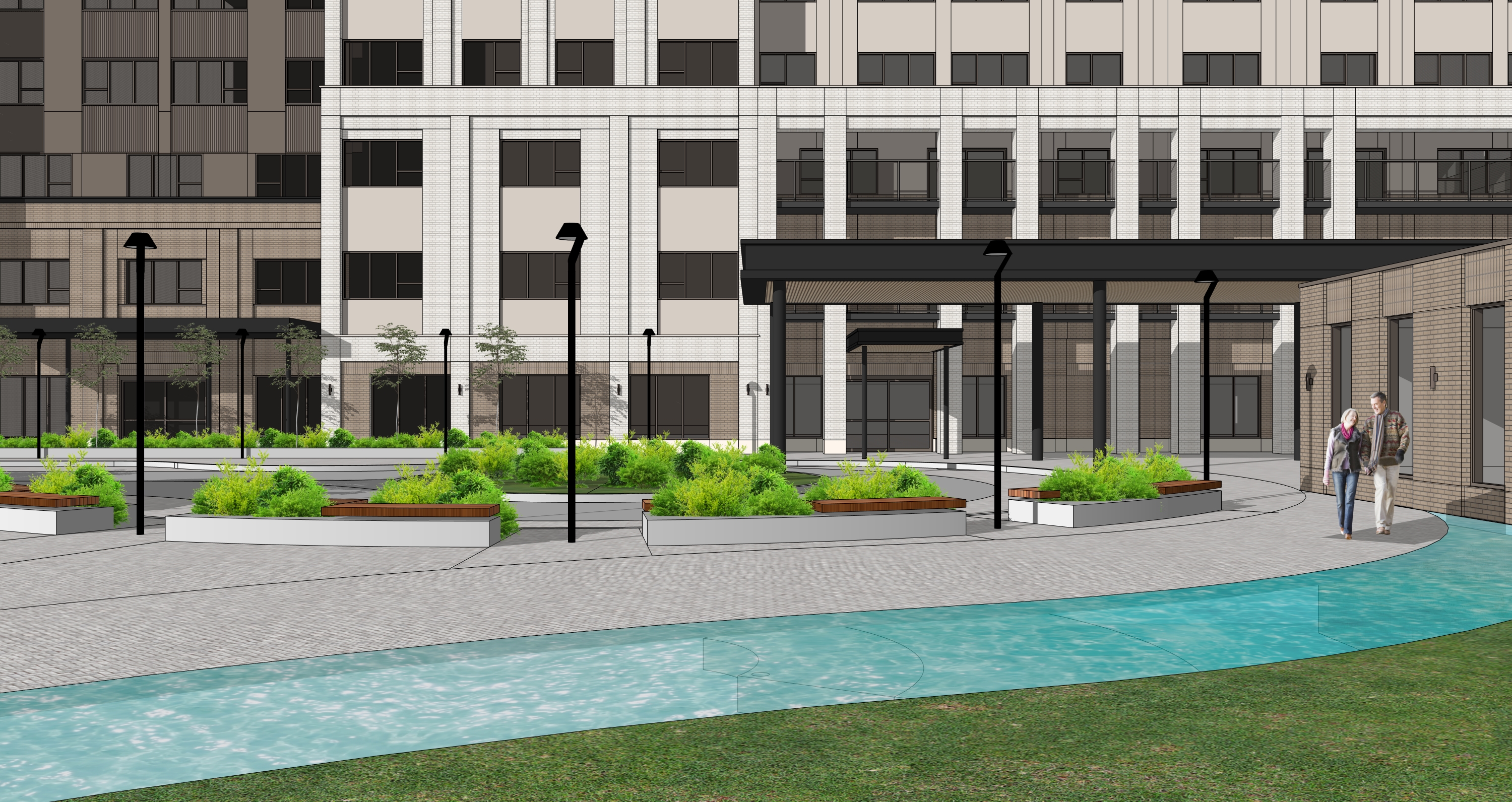 daytime render of a very light beige and brown brick building add people and trees add a hopspitalitu space inside the ground floor add a car dropping someone off under the canopy the water feature in the foreground is bordered by rocks and plants