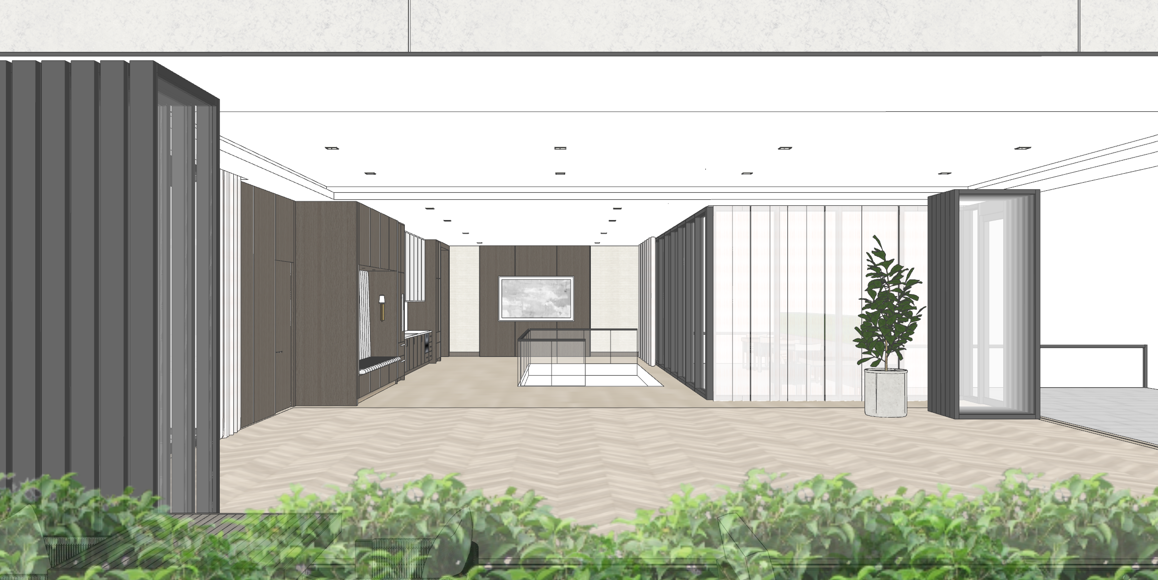 render a luxurious rooftop penthouse with warm natural sunlight the interior should be fully illuminated with artificial lighting including elegant cove lighting integrated within recessed tray ceilings to enhance depth and ambiance use high end contemporary materials and furnishings throughout add a few upscale business people lounging inside the penthouse the lighting should be balanced between the warm late afternoon daylight and interior illumination creating a sophisticated photorealistic scene that highlights the luxury and openness of the penthouse setting all interior lights should be turned on and full lit modern staircase leads to this floor where the haflway glass and floor opening occurs