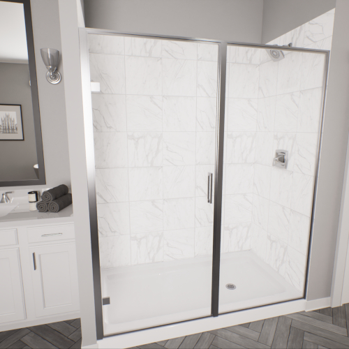 a high end hyper realistic professionally styled real estate photograph of a modern bathroom the scene features strong architectural symmetry and contrast the dominant elements are a large glass panel shower no water spots on the glass