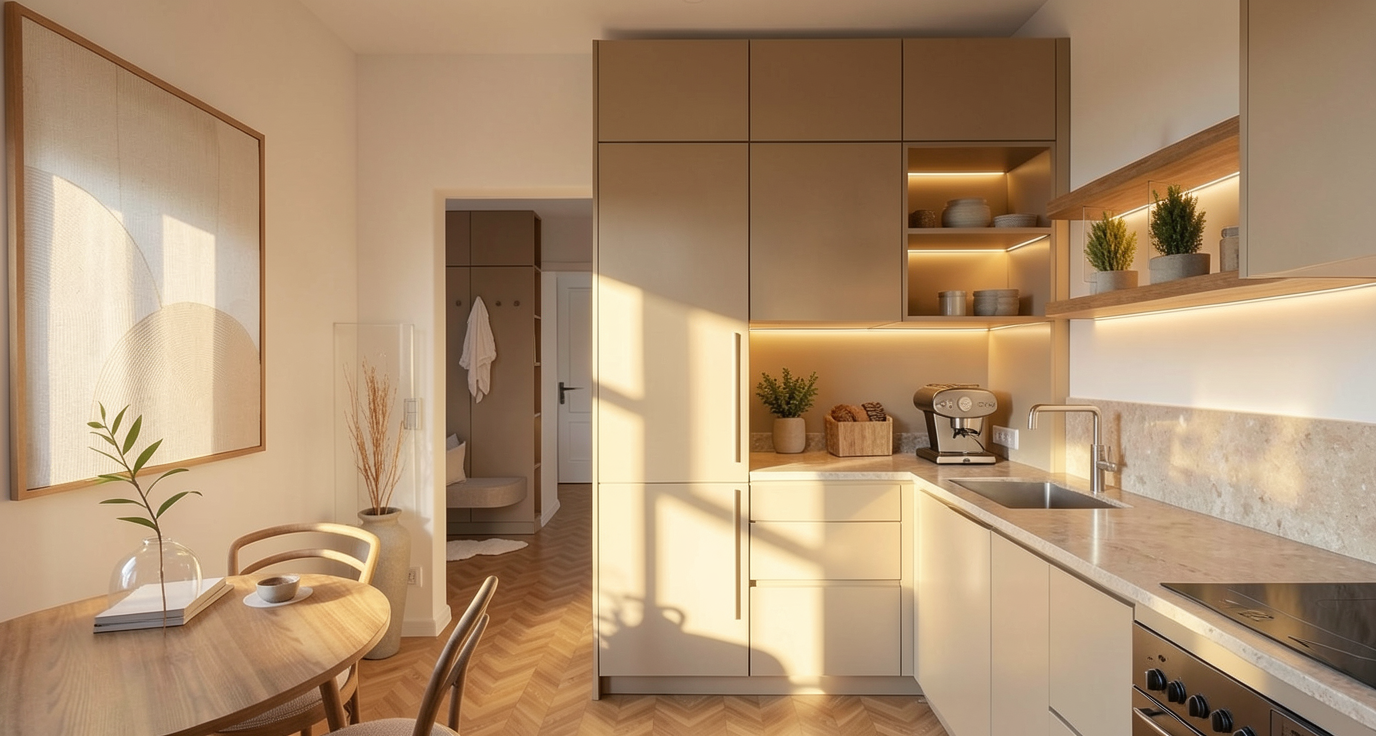 i want a photorealistic image of this render nothing may be changed in the content of the image the floor is a matte beige tile with a slight texture the natural stone is taj mahal type and has a slight gloss the wood is medium gray with slightly deeper grain