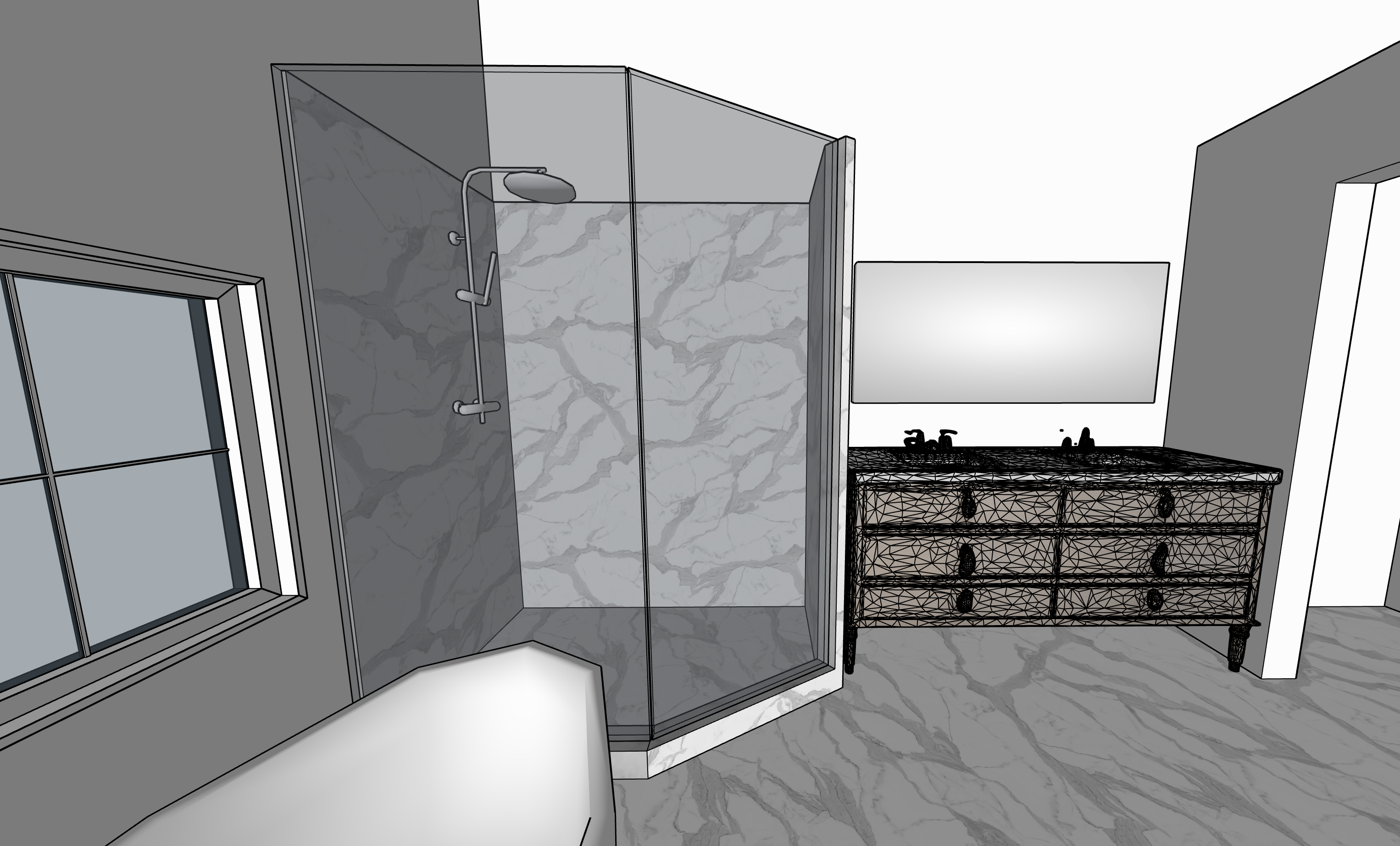finish this render floor and shower is marble with veins vanity is being light brown with white countertop