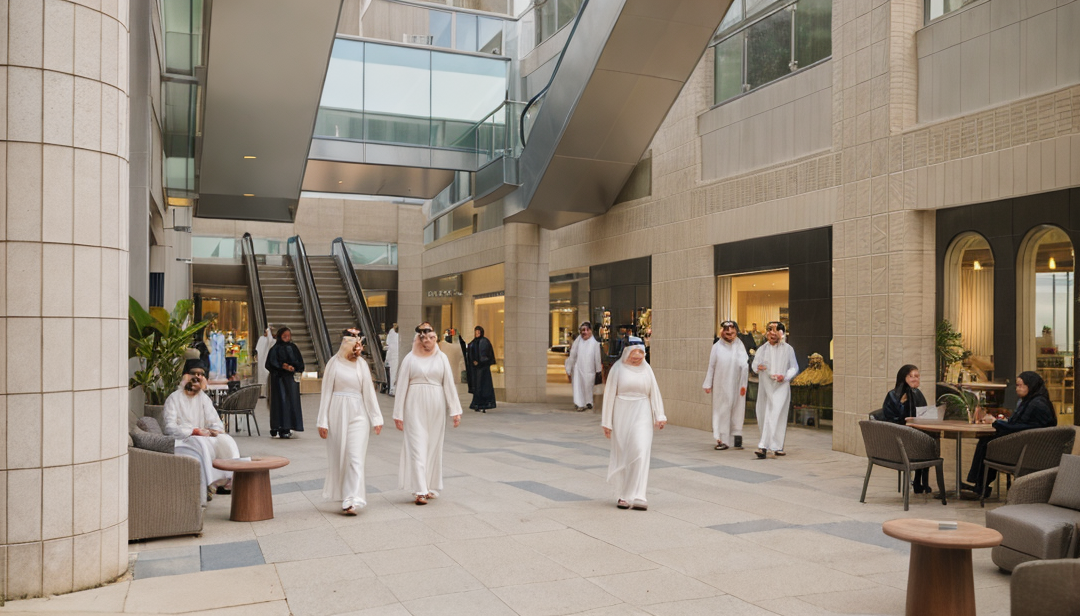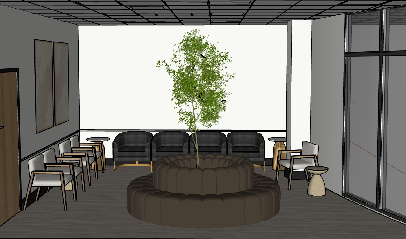 render a modern lobby area with a sophisticated and calm atmosphere the seating consists of plush dark gray chairs arranged against the back wall exuding a sense of comfort and style on the left and right side are white chairs with gold side tables in the center a dark brown circular tufted couch surrounds a tall lush green plant adding a touch of nature and freshness to the space the walls are painted in a soft light gray color featuring minimalistic framed abstract art pieces wooden accents are present in the furniture and the flooring is a sleek grey wood finish large floor to ceiling glass windows on the right allow natural light to flood in creating a bright and welcoming ambiance