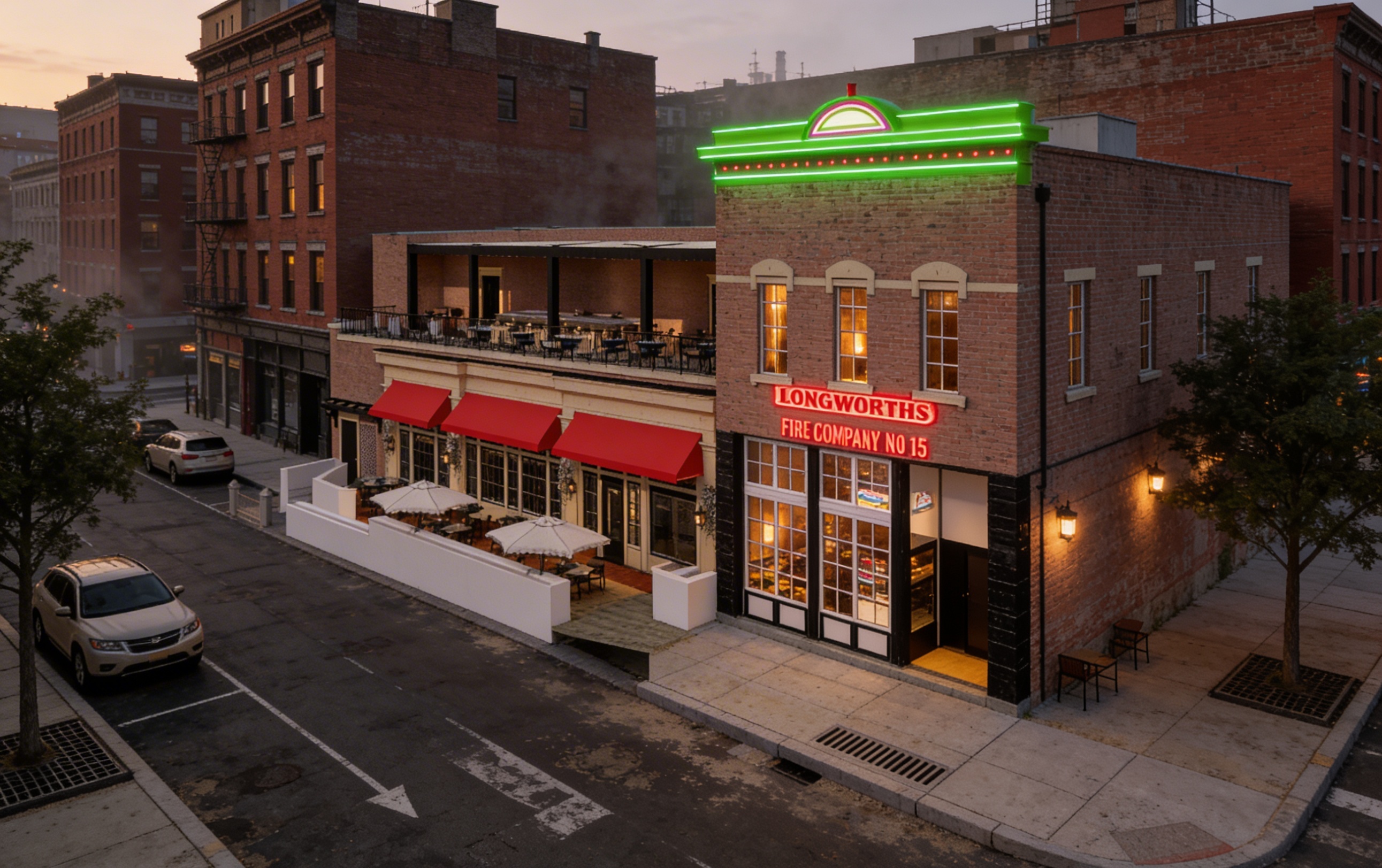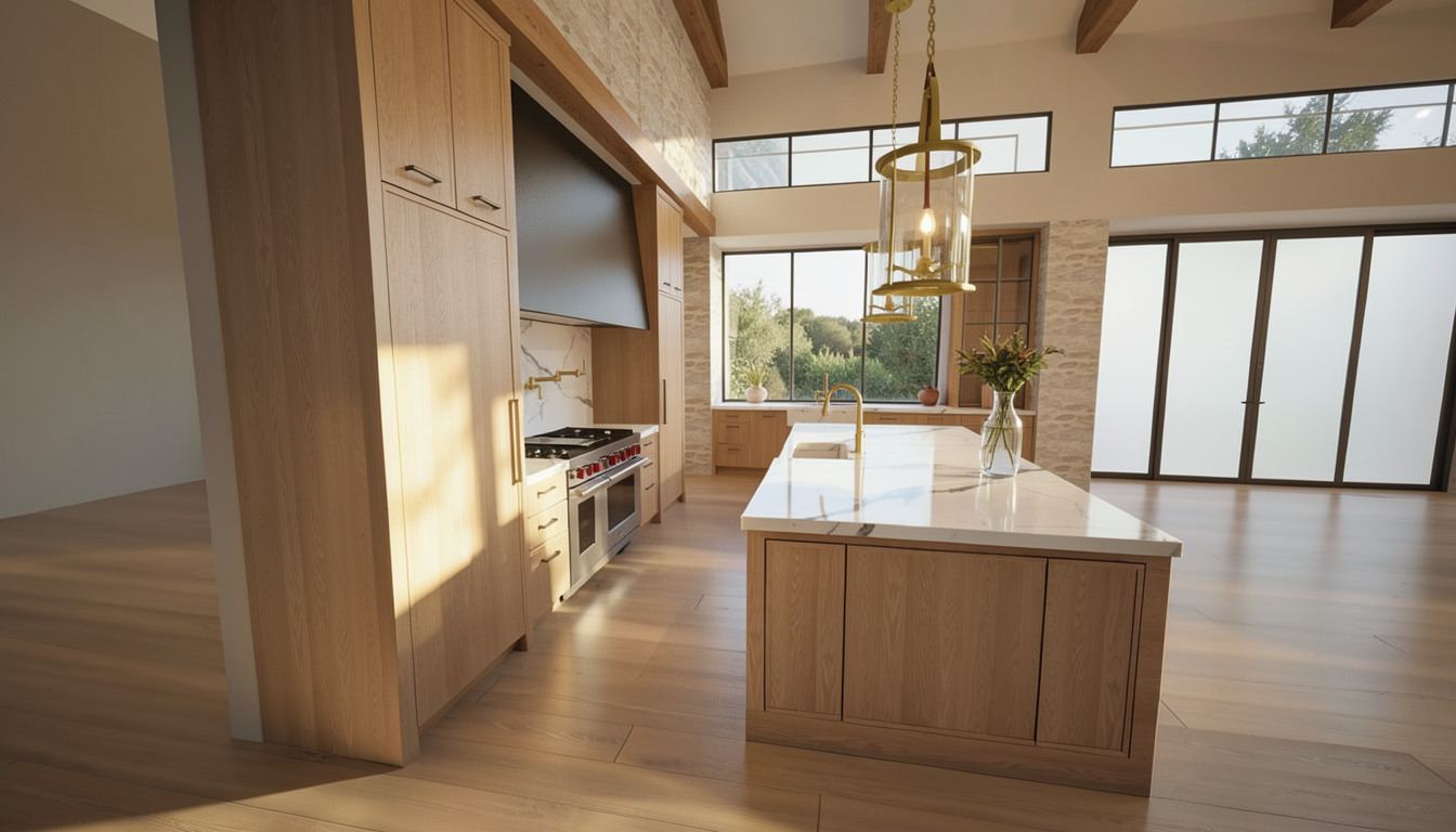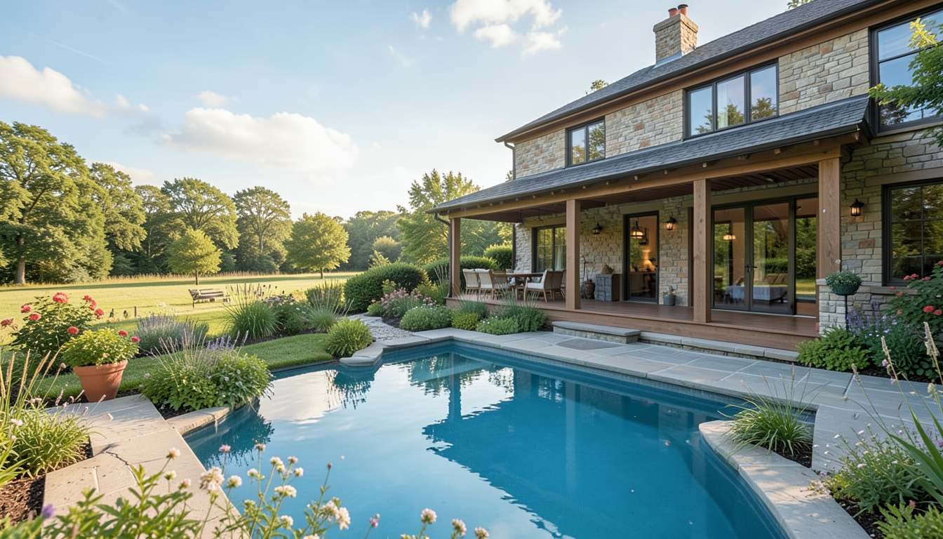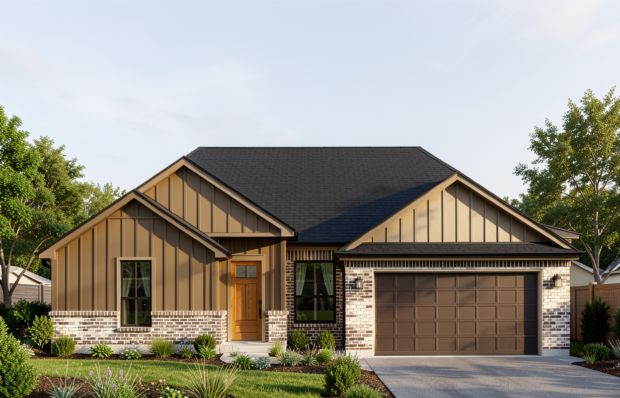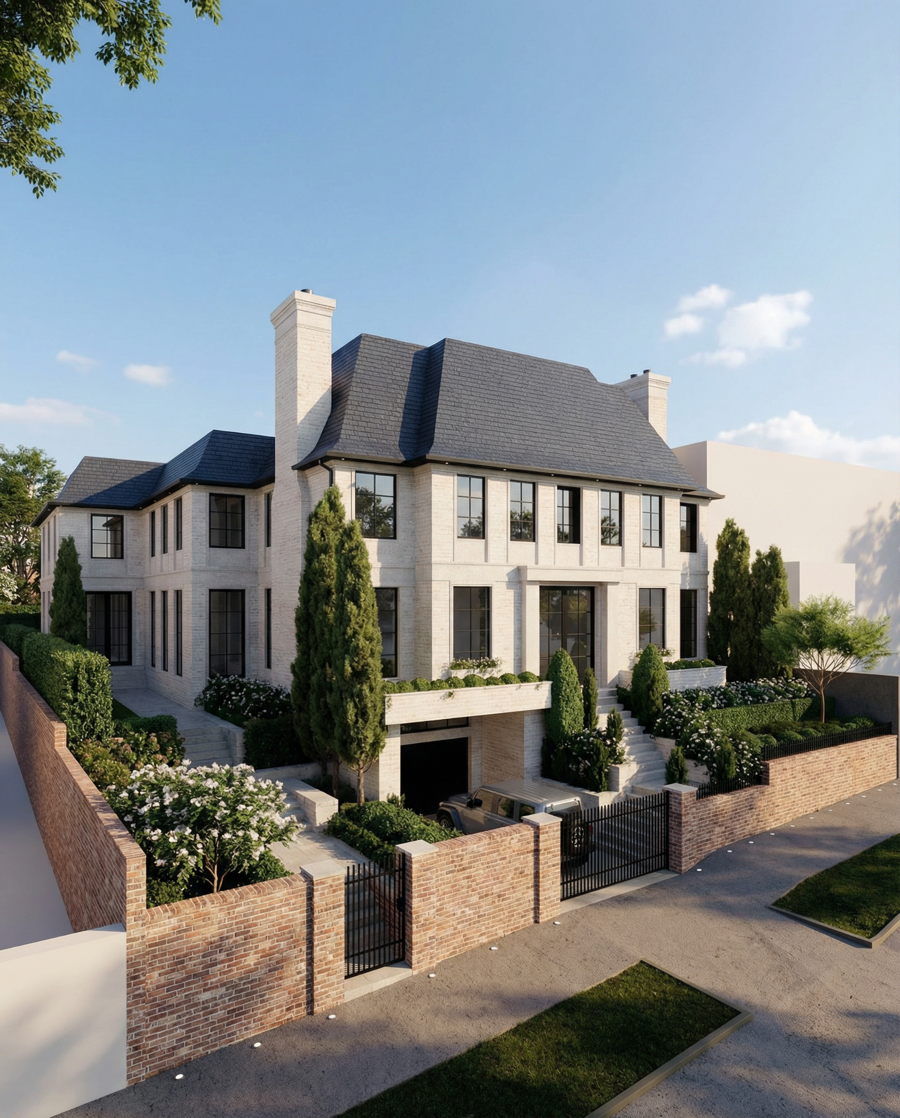 make as photorealistic as possible while keeping textures colors and architectural elements the same as selection add professional landscaping on a lightly wooded scene with good lighting