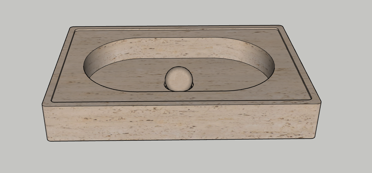 interior shot render a smooth polished stone basin with a central sphere use a warm beige travertine texture with subtle veining the basin has an elegant modern design the lighting is soft creating a serene and calming atmosphere emphasizing the natural stone s beauty and texture background is a muted light gray to complement the warmth of the travertine