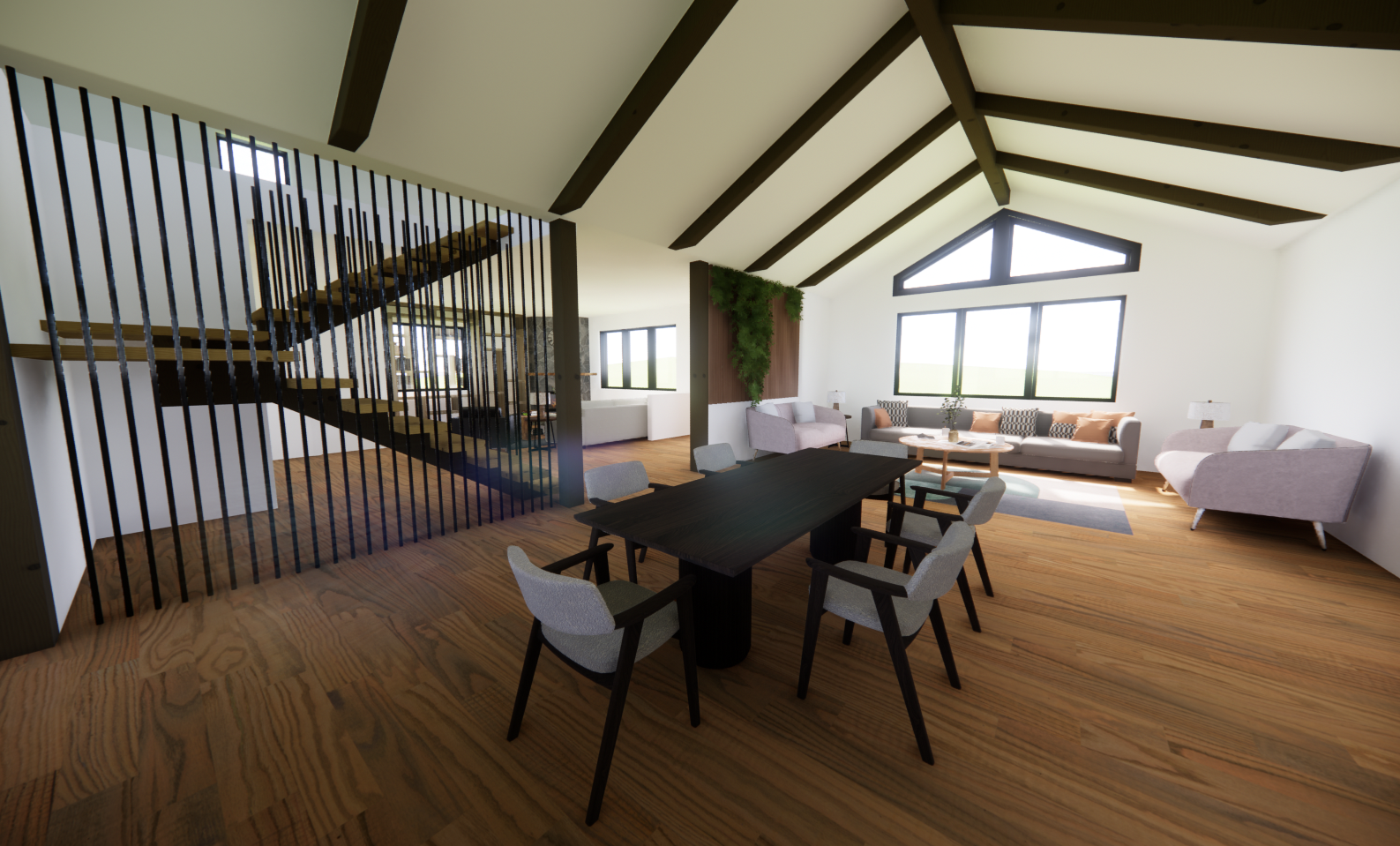 add vegetation outside and decorate the living room in the background