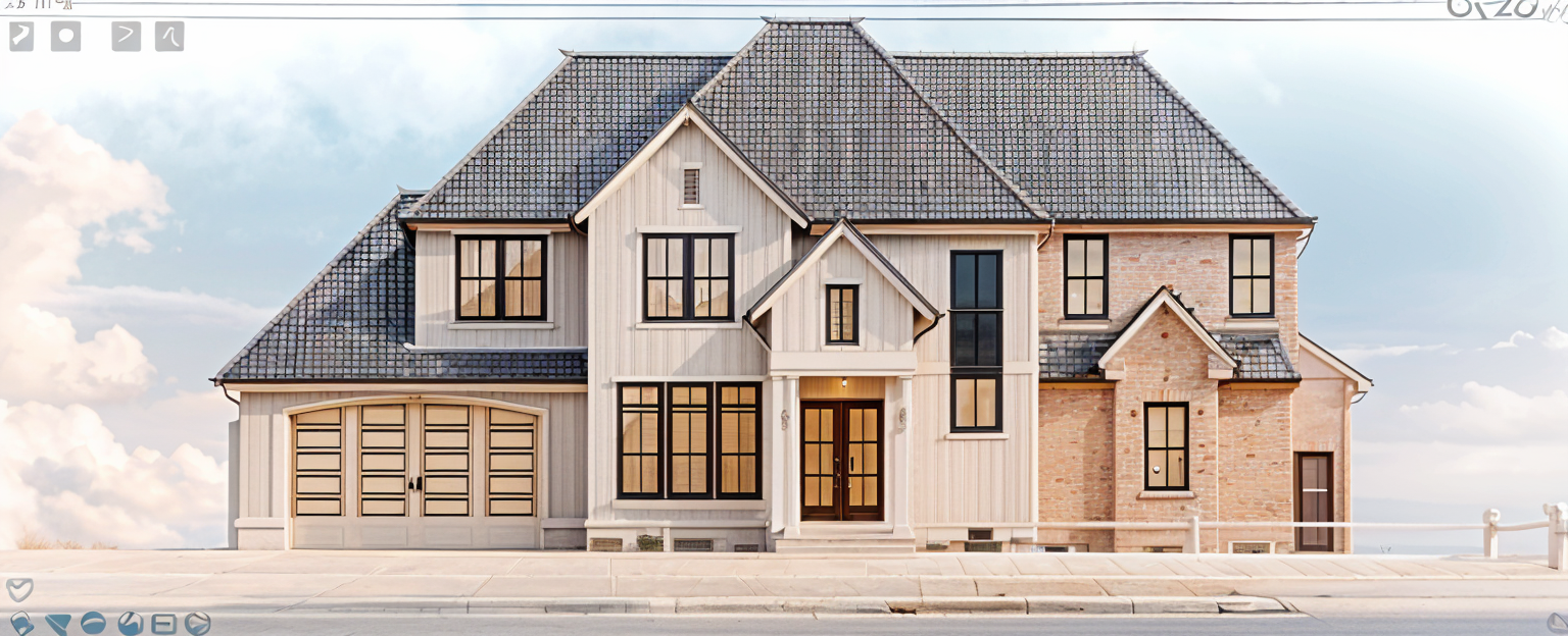 modernist exterior shot hyper realistic stone and black timber facade in field with trees architecture