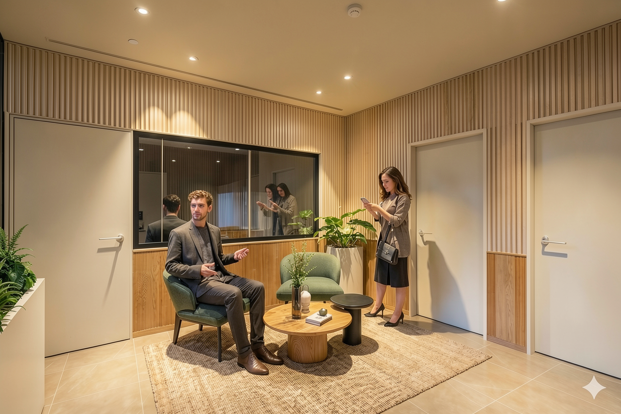 transform the provided corridor interior image into a high end photorealistic render with high end sophisticated warm moody lighting expressing luxury atmosphere while keeping everything exactly the same there is no sunlight or natural light and no windows keep all architectural elements colors and design as they are do not change or add anything different from the design provided enhance lighting keep marble block black the flooring is beige and dark olive or army green marble same pattern as the image wall paper are light grayish beige keep wood color the same medium brown wood no cartoonish look keep overall atmosphere moody sophisticated and realistic make wood lighter reduce exposure reduce shadow effect and contrast increase overall brightness of the image the metal part of wall light is gold reduce exposure just a little