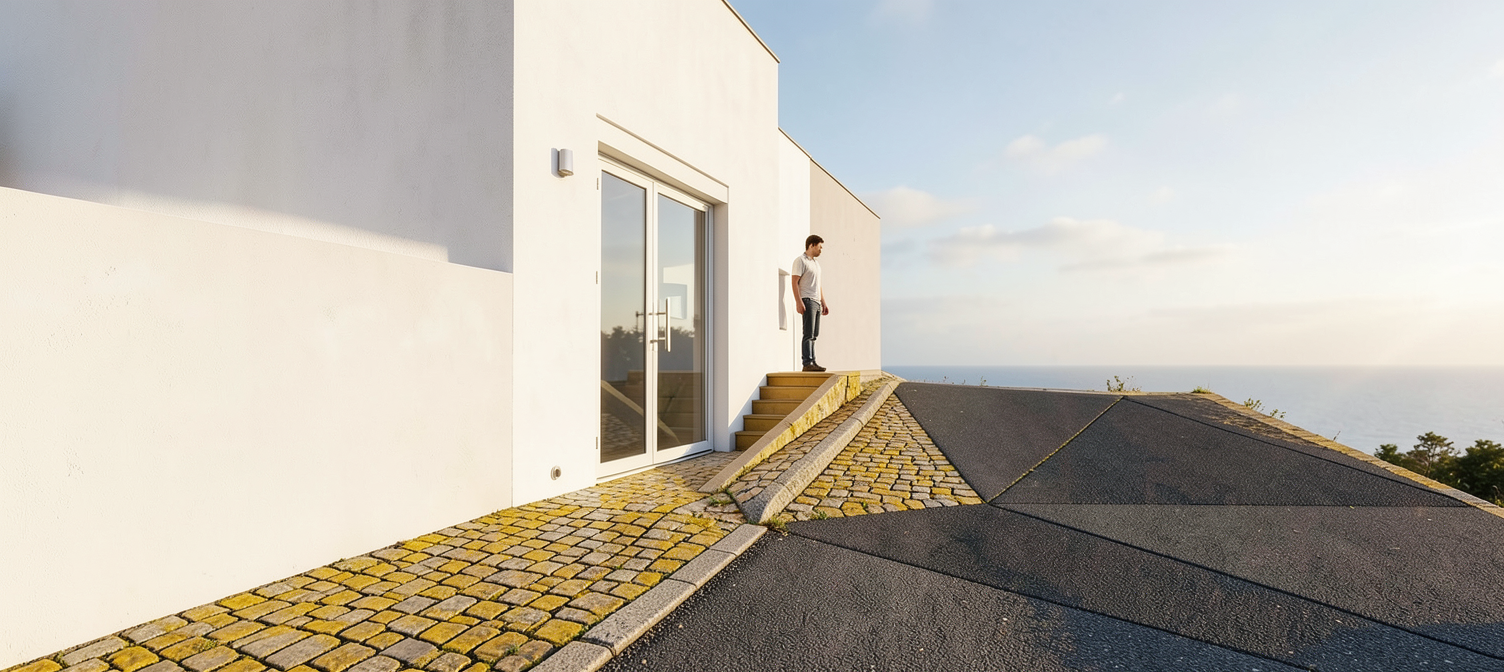add realistic textures instead yellow is cobblestone pavement next to it asphalt road white facade glass doors do not change the composition maintain the scene