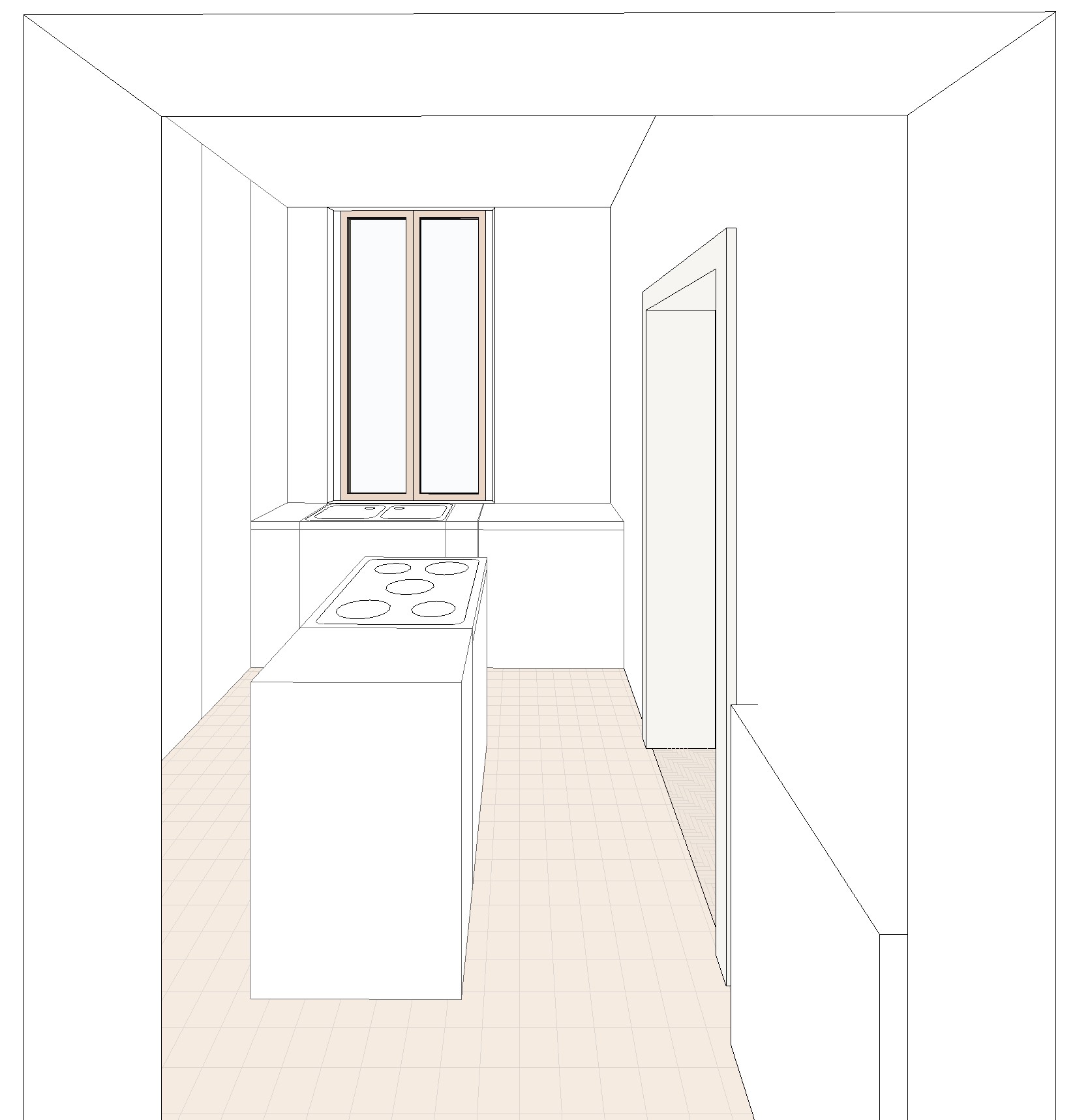 crea un render fotorealistico a partire da questa vista la vista ritrae una cucina vista dalla porta di ingresso sulla sinistra abbiamo dei mobili a tutta altezza con il forno e microonde incassati sulla parete con la finestra c il doppio lavabo e mobili con piano in gres bianco al centro della stanza c una piccola isola con fornelli a induzione e piano di lavoro in gres a cascata il pavimento in gres 60x60 tipologia terrazzo moderno i mobili sono colore grigio beige le pareti sono bianche