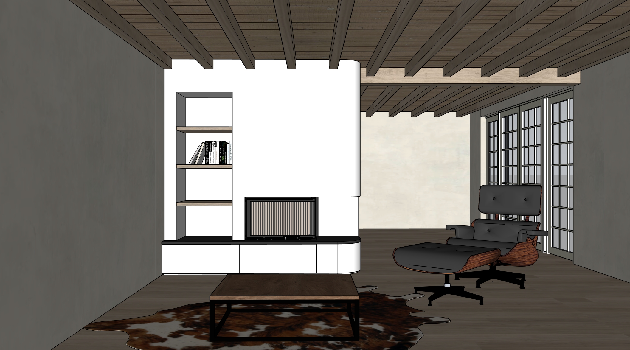 high end living room hoxter ecka 80 slh fireplace strict camera match full scene definition ultra sharp pbr only no redesign create an ultra high end 4k ultra photorealistic architectural interior render based strictly on the uploaded reference image and the detailed material briefing this is an existing interior design the complete spatial layout architectural structure wall positions ceiling geometry fireplace wall volume cabinetry niches window layout ceiling structure furniture placement proportions and circulation must remain 100 identical to the reference image no redesign no reinterpretation no repositioning of any element no extra furniture camera must exactly match the reference treat the reference image as a camera matched architectural backplate camera image quality absolute lock exact same camera position height and distance same framing and crop same perspective and vanishing points architectural full frame lens feeling 24 28 mm perfect verticals no distortion ultra sharp render requirements ultra sharp focus across entire image no depth of field no blur no haze no fog no bloom crisp edges visible micro detail everywhere architecture geometry fixed central sculptural fireplace wall acting as spatial divider built in corner fireplace l shaped glass low base cabinets under fireplace open vertical niche with shelves on the left open passage on the right toward window and kitchen all geometry proportions and alignments must match the reference exactly rounded edges to respect precisely vertical outer corner of fireplace wall radius 20 mm right corner of base cabinets radius 20 mm floor walls ceiling floor rustique oak plank floor planks laid horizontally natural oak color visible grain knots and irregularities real world plank scale matte to satin finish soft daylight reflections walls limeplaster color pure white material very rough limeplaster strong handcrafted texture irregular trowel marks fully matte texture clearly readable in grazing daylight fireplace wall base cabinets color identical white as walls completely smooth and flat no texture matte not chalky fireplace top neolith nero satin deep black mineral stone satin velvety matte surface sharp crisp edges wood elements critical realism applies to floor ceiling slats ceiling beams niche shelves coffee table top lounge chair wooden shell material natural rustic oak same tone across all elements visible knots and grain variation no texture repetition no mirrored grain correct grain direction per element matte natural oil finish real depth pores and micro imperfections ceiling horizontal wooden slats vertical wooden beams crossing the slats same rustic oak as floor rough non refined visible knots fireplace hoxter ecka 80 slh critical built in hoxter ecka 80 slh corner fireplace black steel frame clean minimalist appearance interior wood realistic firebox interior dark refractory interior material real stacked firewood correct log scale and placement natural wood texture cracked bark varied diameters fire ultra realistic natural wood fire true flame physics orange and yellow flames with subtle blue base natural flicker and movement no gas look no artificial symmetry light interaction warm firelight reflecting subtly on fireplace interior neolith top nearby floor no over glow no bloom no smoke no sparks furniture textiles lounge chair ottoman iconic lounge chair wooden shell in same oak tone as floor black natural leather upholstery matte leather with subtle creasing black metal base coffee table rectangular low table black metal legs wooden top in oak identical to floor rug cowhide rug same color pattern as reference image brown white natural pattern clearly hairy texture visible individual hairs organic shape windows view background windows large glazed fa ade with fine grid division dark metal frames exterior view open countryside green fields calm rural landscape no buildings background kitchen visible behind chair left of window fully white kitchen vertical line structure on fronts black countertop subtle tasteful rural decor clean uncluttered realistic lighting primary light natural daylight only soft sky diffusion subtle sunlight entering space realistic soft shadows no led lighting no indirect lighting no artificial accent lighting fireplace contributes subtle warm light only material realism pbr only mandatory all materials must be physically correct pbr correct roughness maps normal micro normal detail real fresnel reflections physically accurate ior no generic shaders no flat surfaces no plastic look materials must clearly react to light render quality ultra photorealistic ultra sharp 4k quality high sample count clean global illumination crisp shadows sharp reflections no denoiser blur no post processing haze negative prompt mandatory cgi look render look illustration sketch style cartoon style stylized lighting cinematic lighting dramatic contrast flat lighting wrong colors wrong proportions wrong fireplace model gas flames fake fire flat fire texture smoke sparks bloom glow effects depth of field blur haze fog noise grain oversharpening low detail low resolution repeated textures texture tiling mirrored wood grain plastic materials glossy walls extra lighting led strips added furniture removed elements changed decor camera change zoom crop different perspective warped verticals people reflections of people clutter game engine look