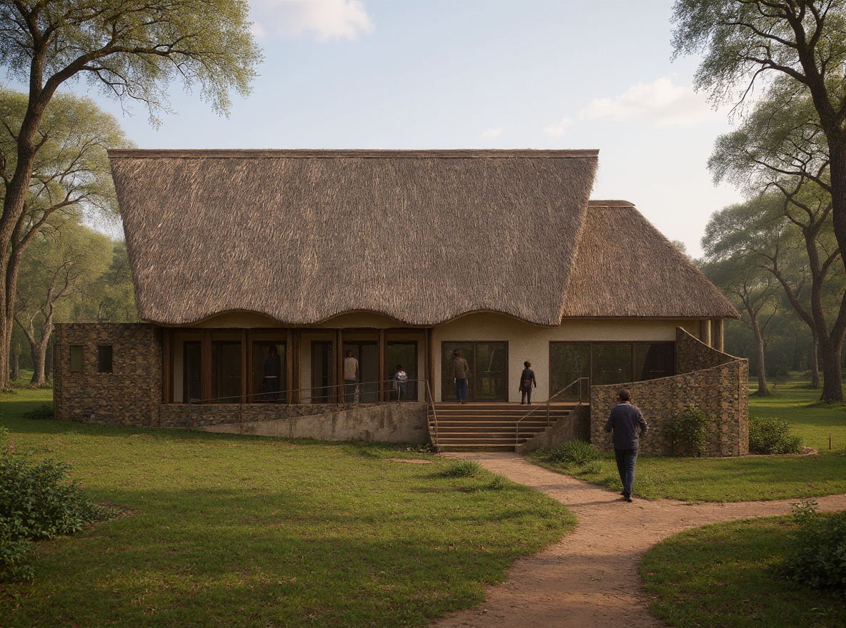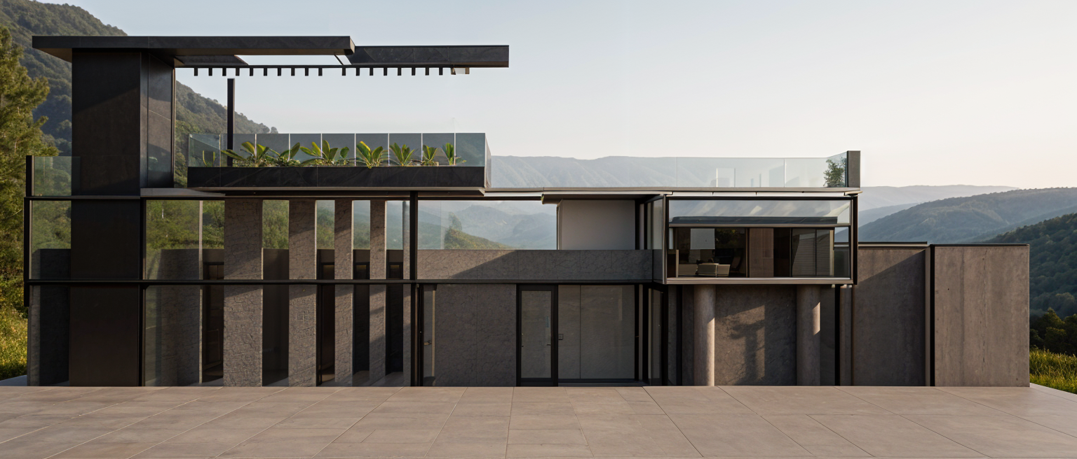black board and batten cladding black roof black window frames lawn extensive native gardens trees in background sunset interior lights on