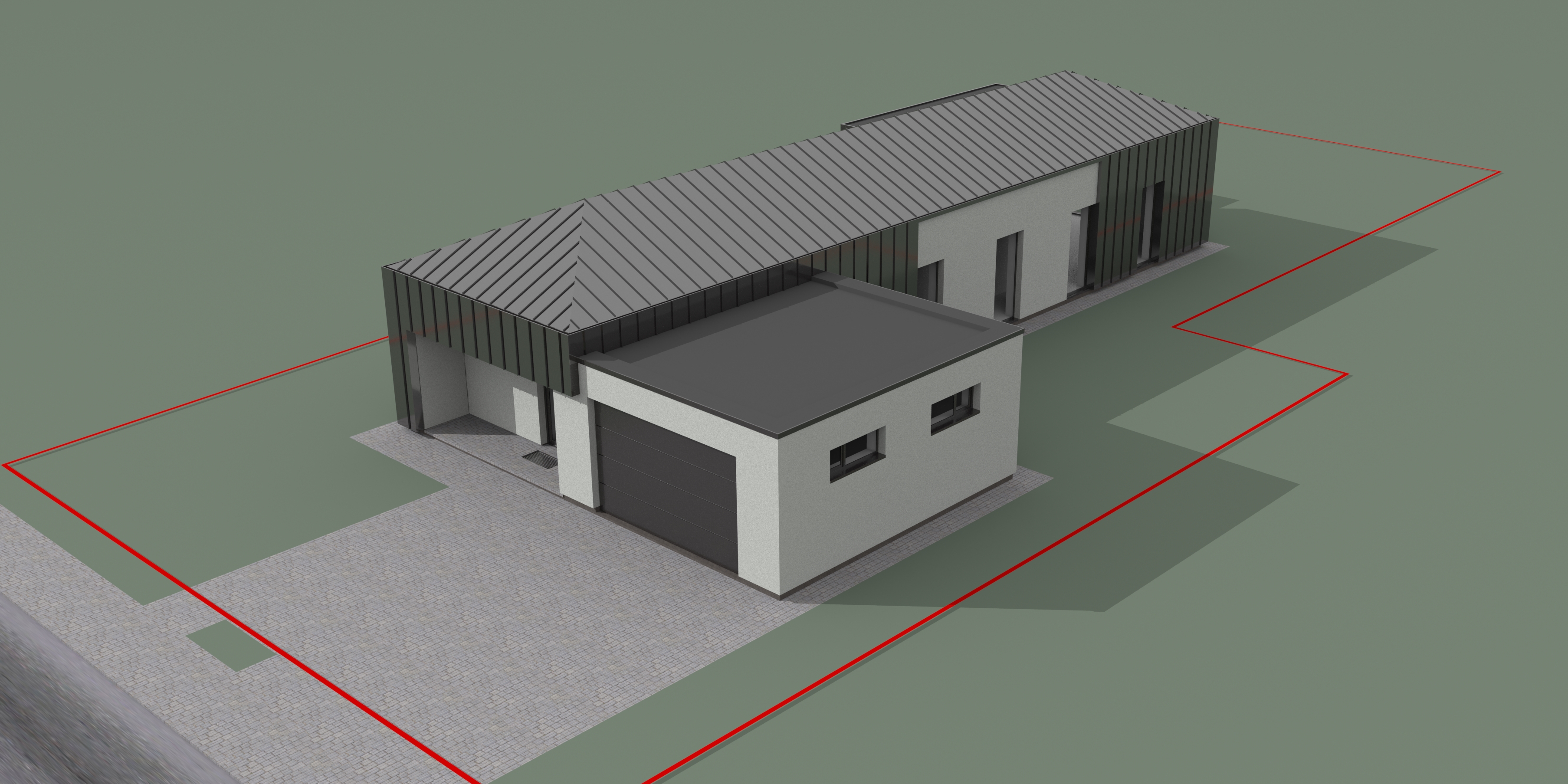 modern architectural building with a sleek minimalist design exterior features dark charcoal gray sheet metal panels with a matte finish contrasting with smooth light grey plaster sections roof is a matching dark gray creating a cohesive look ground is covered with soft green grass grey paving and asphalt road the atmosphere is serene and contemporary with soft natural lighting from an overcast sky highlighting the sharp lines and textures change red line to dark grey metal wire fence