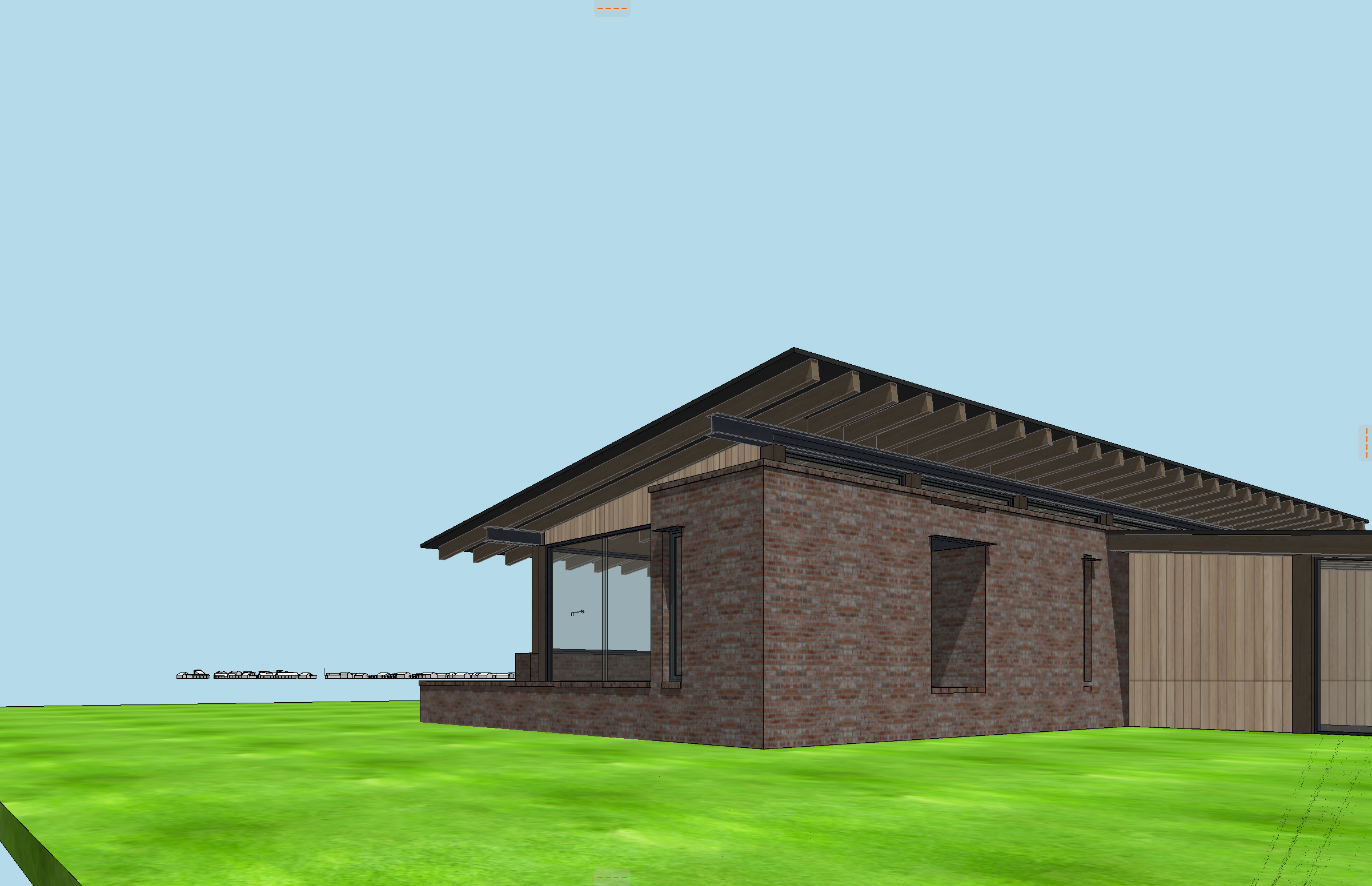 antique brick house with timber columns steel beams glass windows reclaimed pine soffit and a standing seam roof wild lousiana grasses and vibrant wildflowers all the way to house yellow pine trees in the background lake in the distance clouds in the sky all glass should be reflective so that in the interior of the house is not visible